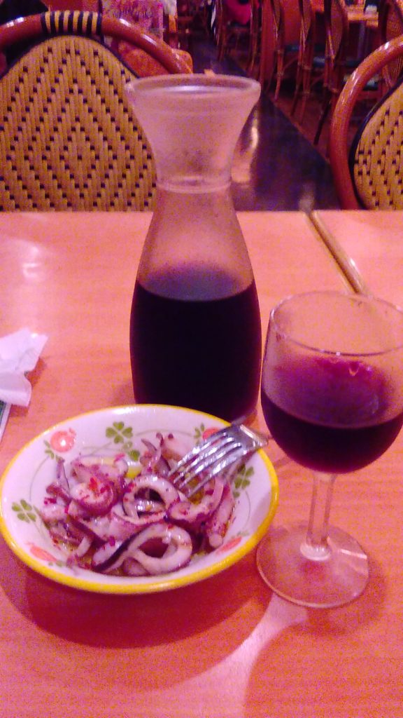 まず最初に赤ワインのデカンタ(500ml)を頼みます。そこそこ美味しい赤ワイン(500ml)ですが、なんと399円(税込)でした。コスパ最?価格安すぎ(不思議ですが、売上も利益も右肩上がりの状況になるのをっていので垣 会長、堀埜社長の経営手腕には頭が下がります。