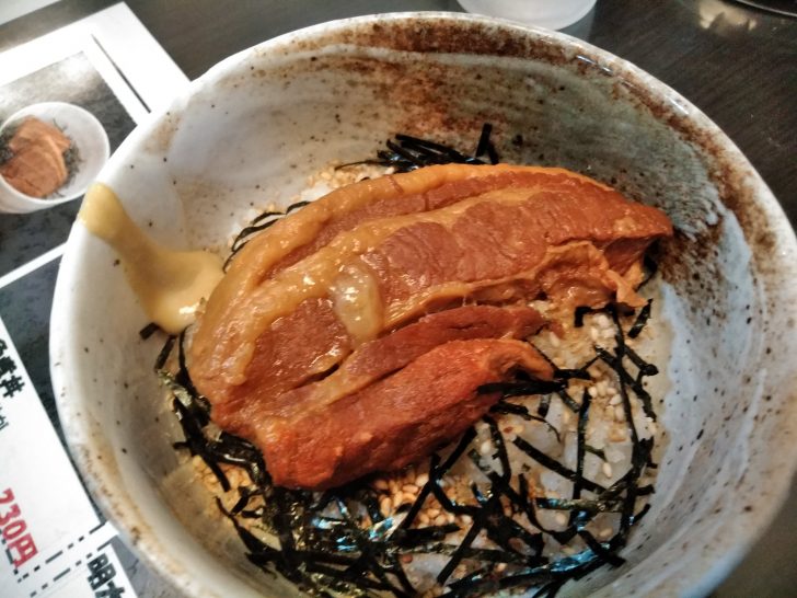 ミニ角煮丼は。ミニといっても結構ボリュームがあります。でっかい豚角煮ときざみ海苔、ごはんに甘めのたれが掛ってます。これもいつもどおり、美味しいです。