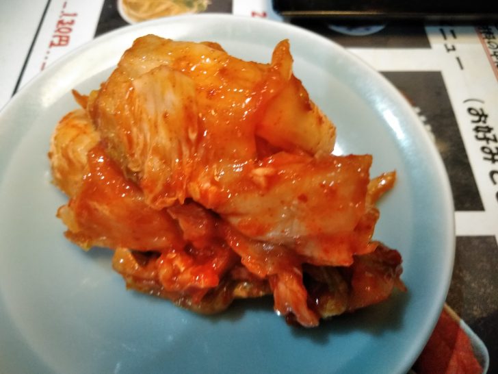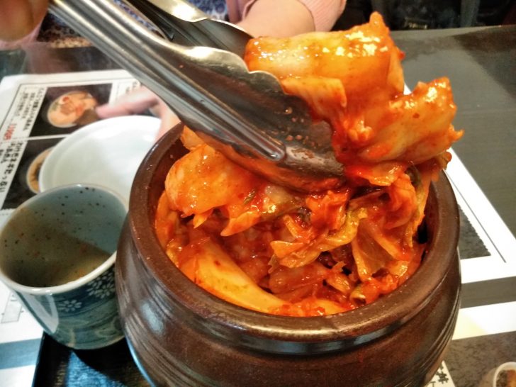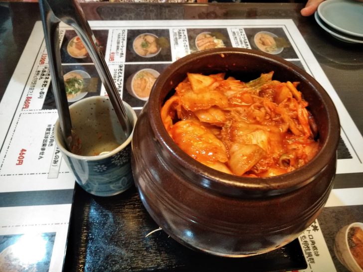 今日注文したのは、私はミニ角煮丼セット(840円)、かみさんは杏仁豆腐セット(770円)です。まずは、サービスのキムチが出てきました。食べ放題なのですが、これが美味しいんです。ついつい沢山食べてしまいます。