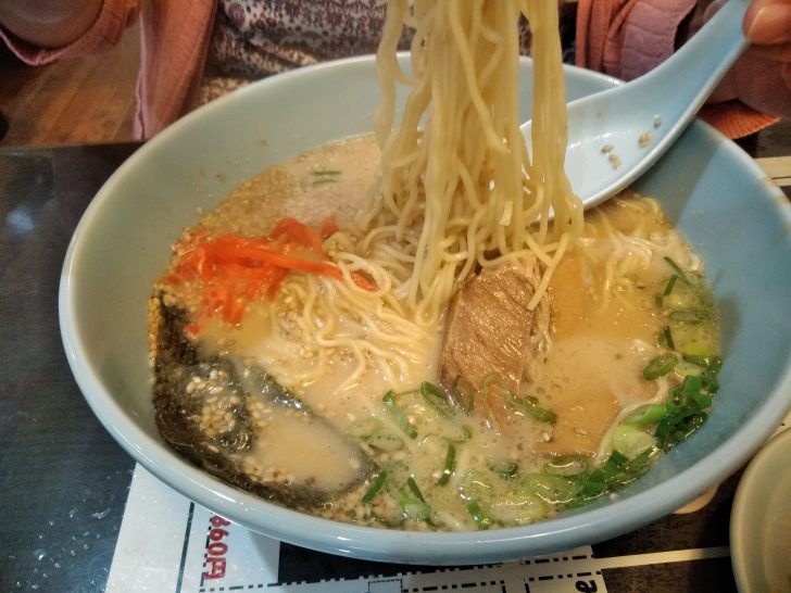 とんこつらあめんには、角煮チャーシュー、ねぎ、海苔が載っています。これに紅しょうがを入れて!ここのとんこつらあめんはあっさりしたスープに細麺で、物足りないという方もいるようですが、私と私の家族はこのスープと麺が大好きです。それととんこつ独特の臭いがあまりしないのも良いです。