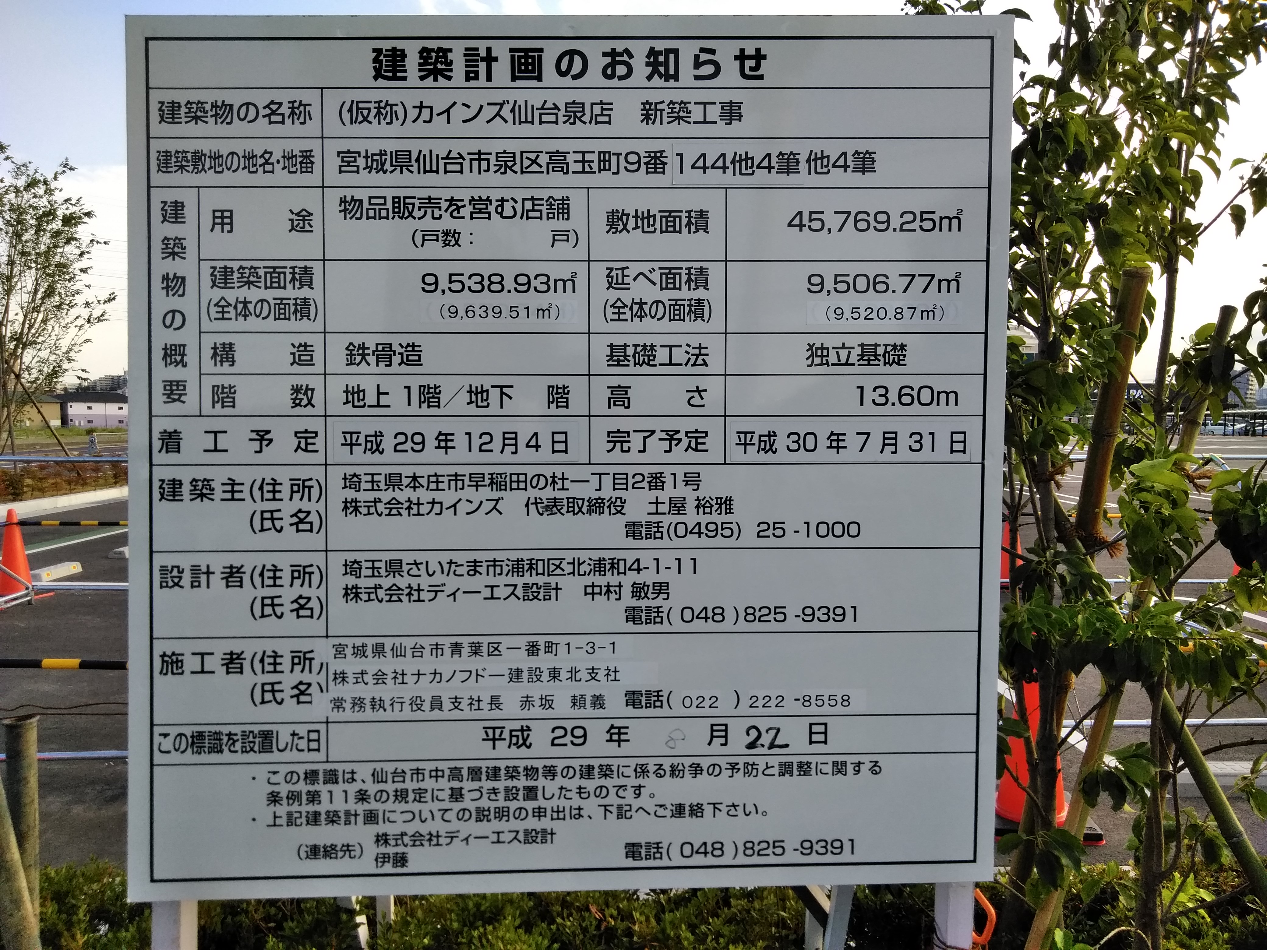 カインズ仙台泉店の設計はディーエス設計(さいたま市)に委託、施設はS1F延べ9506.77㎡を想定しており、内部には物品販売を営む店舗を設けるらしいです!