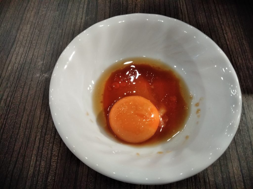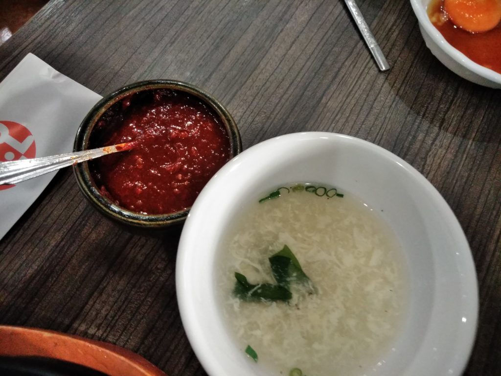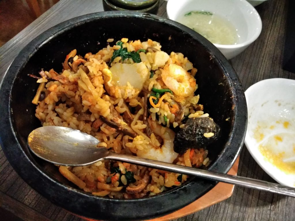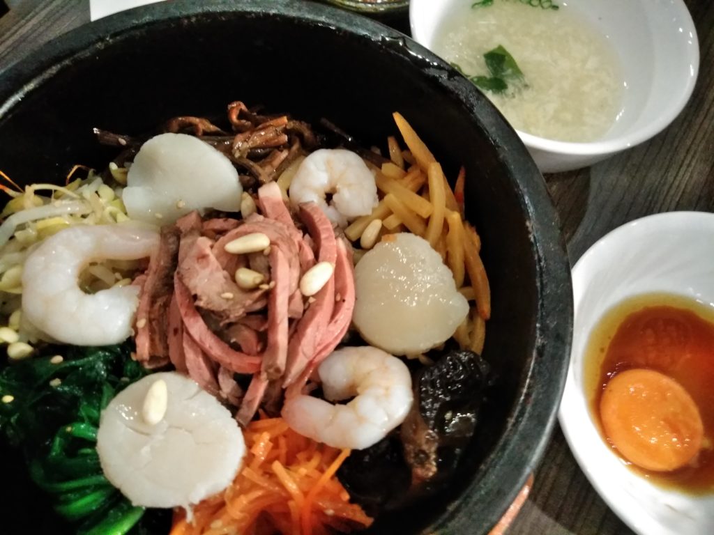 作り方は、特製たれがかかった卵をかき混ぜてビビンバにかけて、全体をしっかりとかき混ぜる。薬膳ジャンをスプーン1杯入れて、更に良くかき混ぜて、できあがり!薬膳ジャンは甘めでした。食べて見たら激うまでした。おこげがまた旨かった。えび、ホタテなどは当然旨いのですが、個人的には、きくらげが旨かったですね。それにけっこうボリューム満点であり、大満足でした。