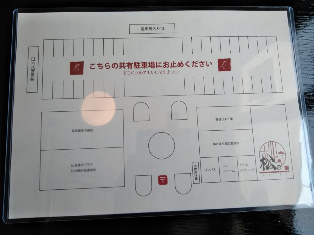 メニューの裏面には駐車場の図が描いてありました。駐車場は共有で40台分あります。輪止めに予備校名とか書いてありましたが、どこに止めてもOKみたいです。