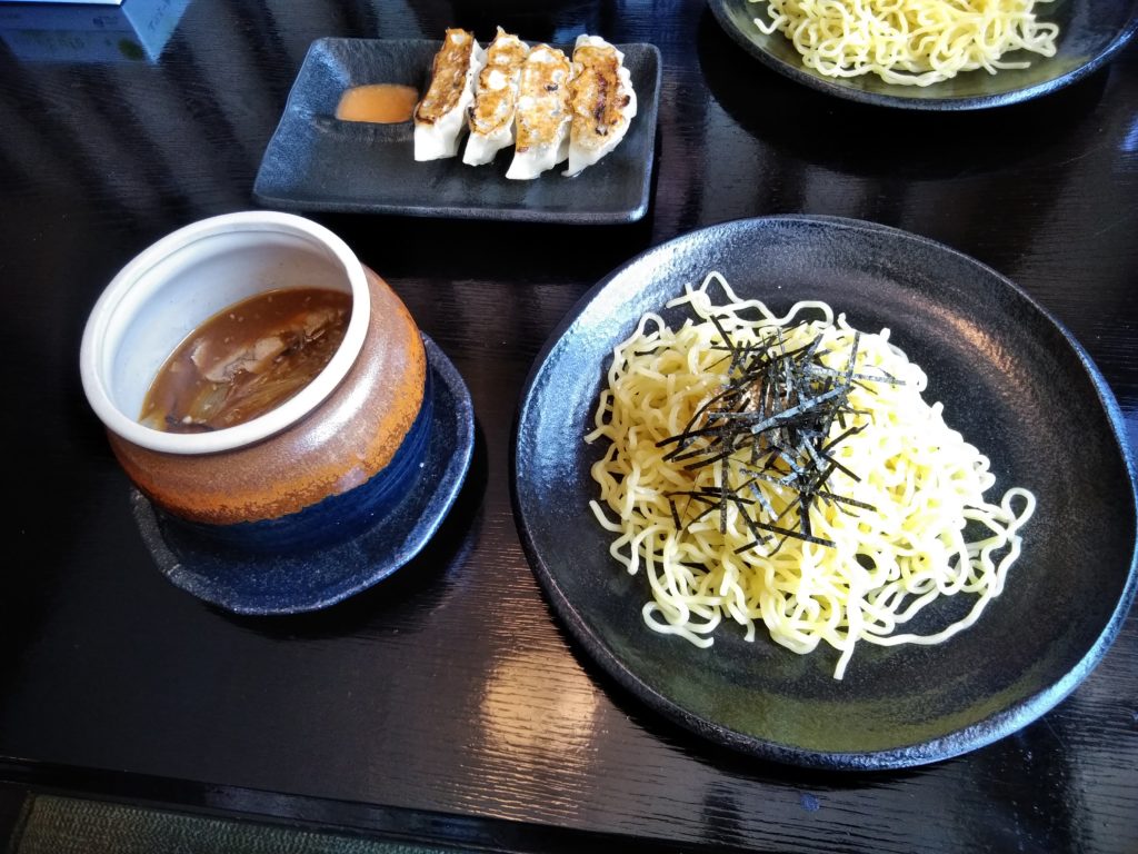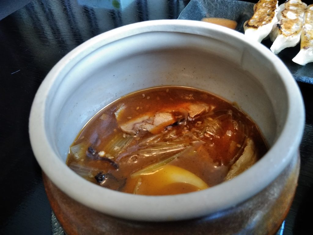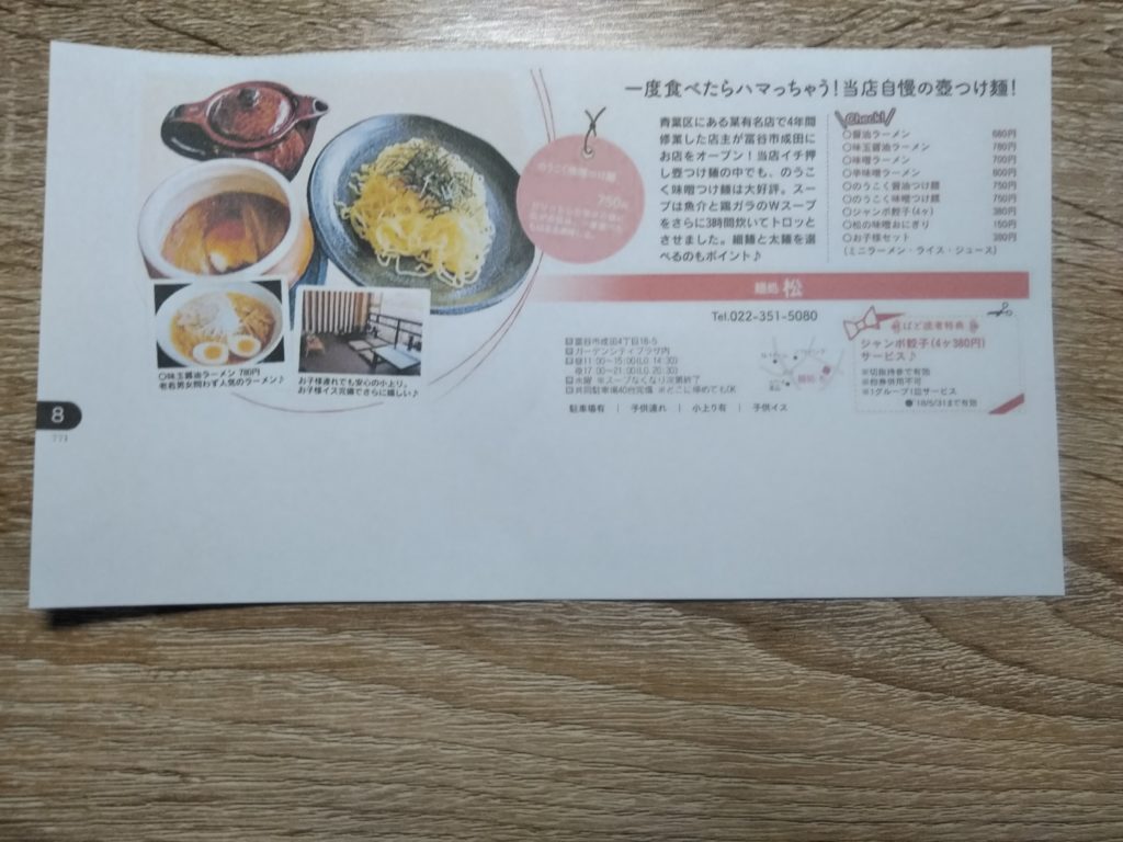 今回は一番人気の壺つけ麺 のうこく味噌つけ麺(太麺)750円を注文しました。それから、ぱど 富谷・泉エリア2018.05.01版にジャンボ餃子(4ケ380円)サービス券が付いていたので、ジャンボ餃子も注文しました。