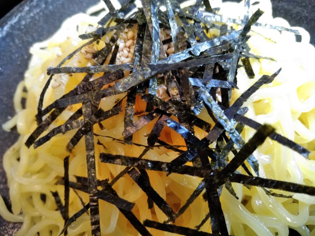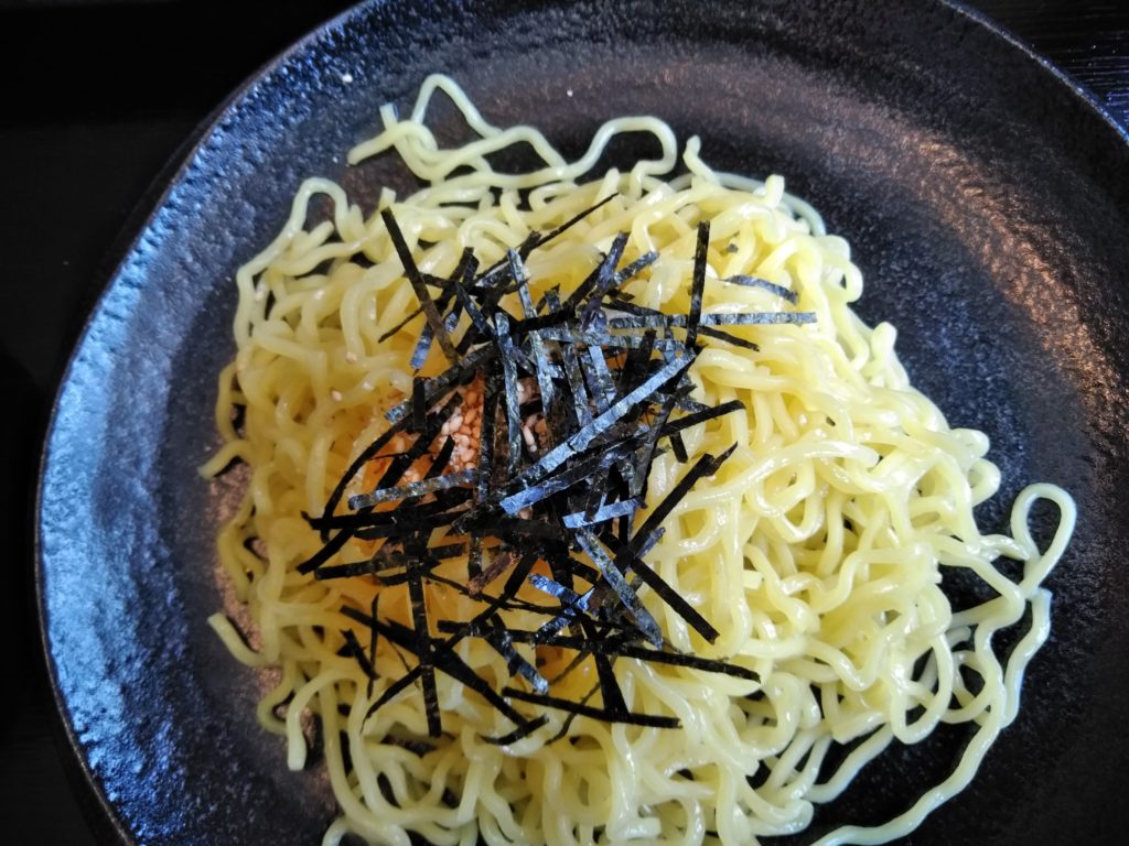 麺は太麺を注文したのですが、そんなに太くないようですね。これが太麺なら、細麺はどんなんでしょうか?麺は冷たく、きざみ海苔とごまがかけてあります。麺の量は、あまり多くないようです。沢山食べる人は、大盛り+100円、特盛り+150円を注文した方が良いと思います。