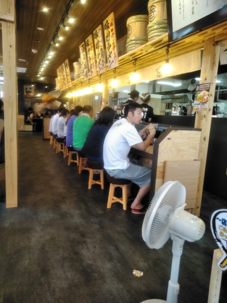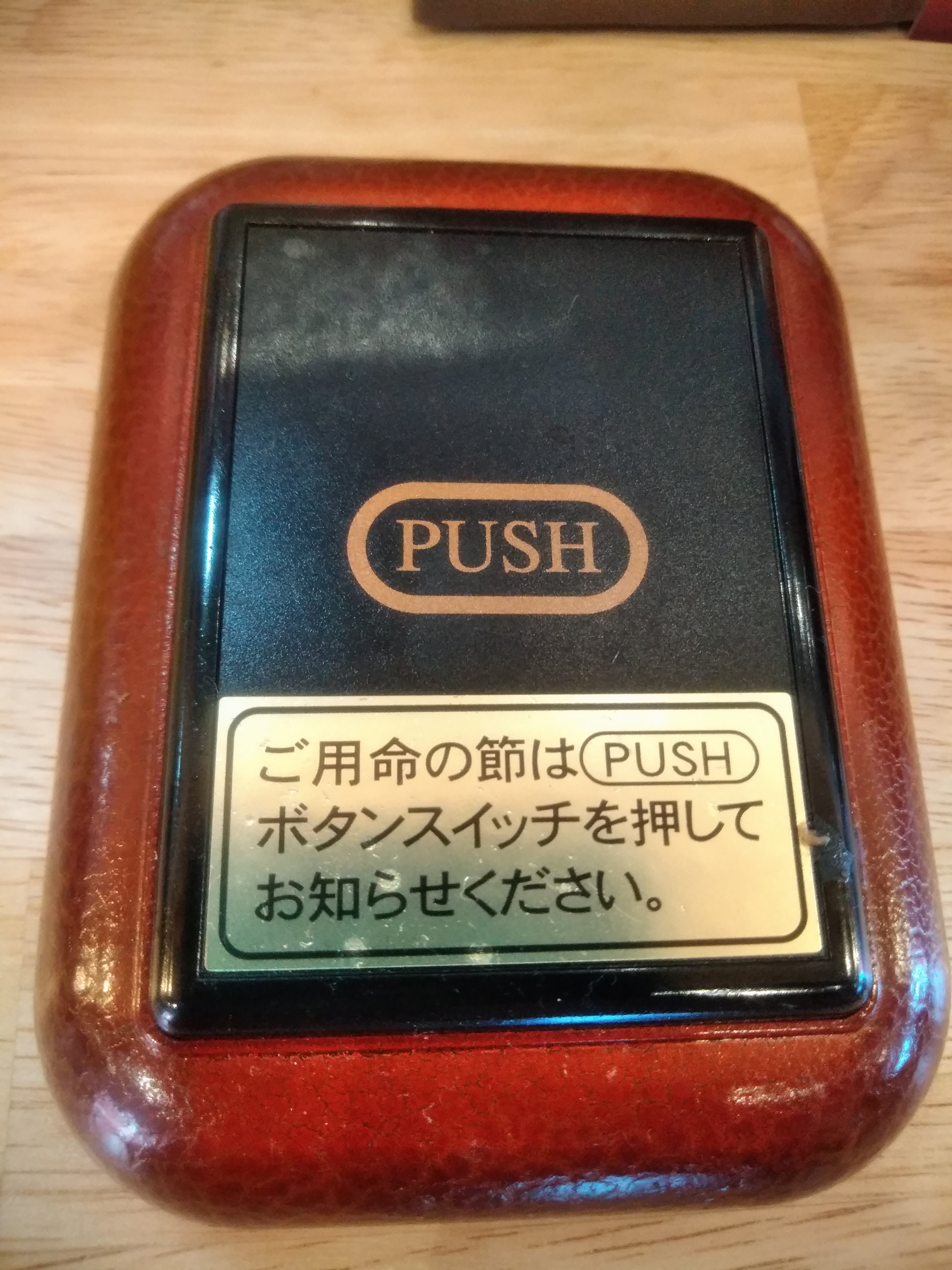 通常の場合、店員さんを呼ぶ場合は、この呼び出しベルを使うようですが、今日は、メニューがひとつなのと、混雑しているので待合席で店員さんが注文を取ってくれました。尚、ラーメン普通か大盛り(108円増し)と無料半ライス有無を確認してました。