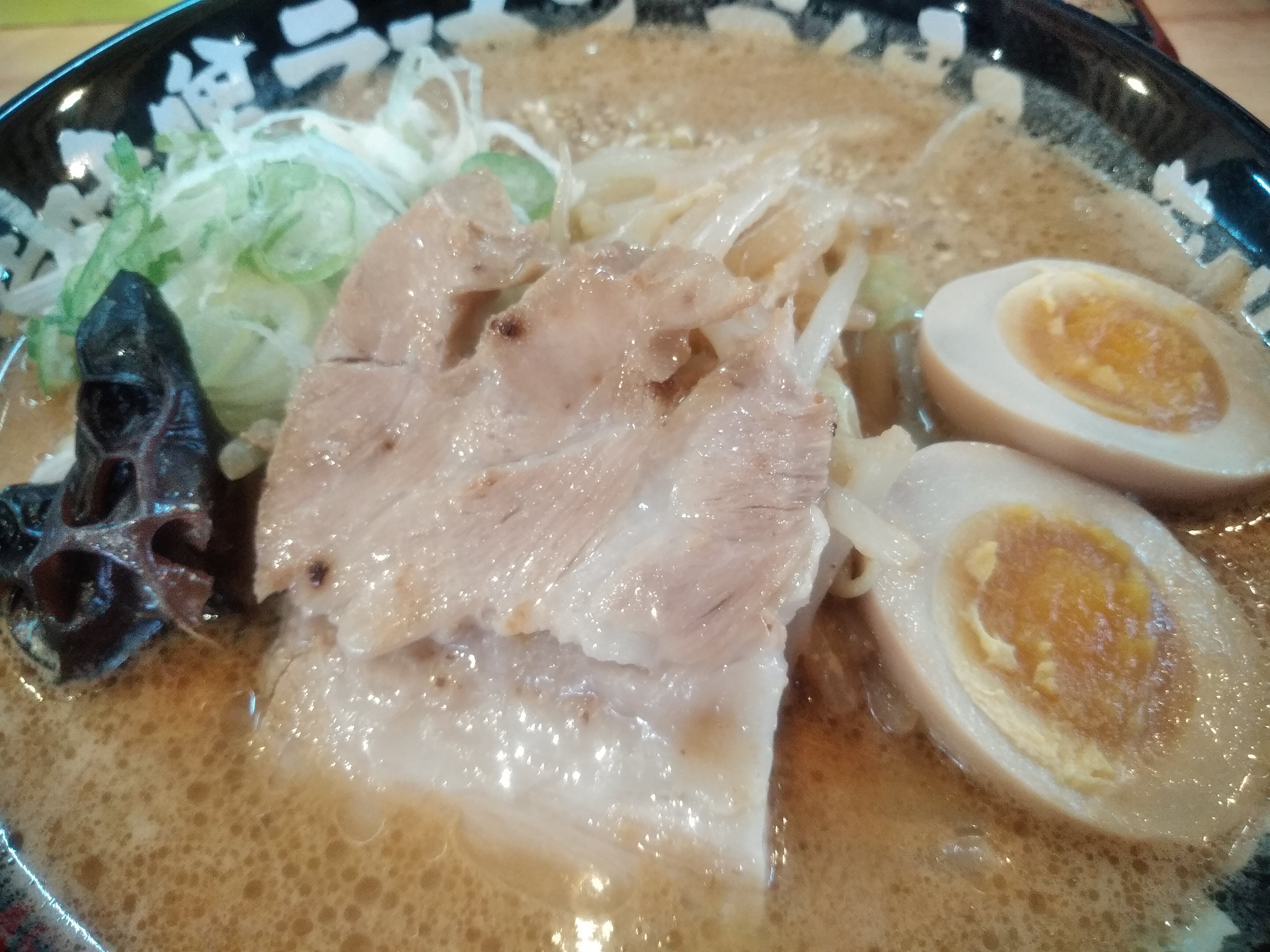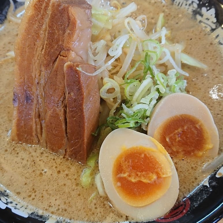 味玉味噌ラーメンがやっと着丼しました。今日は、暑いなか、1時間15分位並んでやっと食べることができました。麺は中太の縮れ麺ですね。具材は大きくて肉厚のチャーシュー1枚、半熟煮玉子1個きくらげ1切れ、もやし多量、キャベツ少々、ネギ多めです。さて特製味噌スープですが、甘めの味噌の濃厚なスープで凄くうまかったです。スープには豚の背油も入っているようで、コクもありましたね。感想としては、キャベツが1切れしかない?きくらげが硬かったくらいでスープも麺も美味しかったですし、チャーシューもトロトロとしてうまかったです。