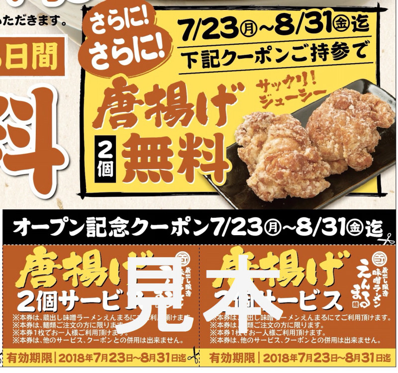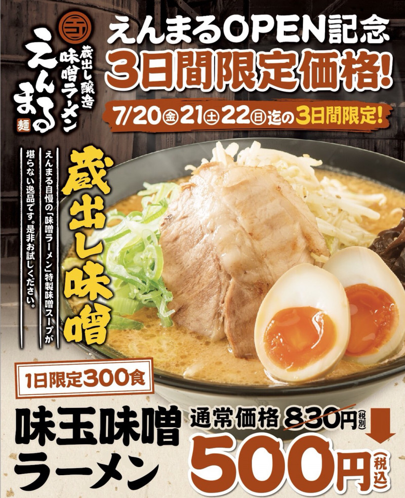 蔵出し醸造味噌ラーメンえんまるがついにグランドオープンしました。早速行ってきましたので紹介したいと思います。えんまるのグランドオープン日は7/20(金曜日)です。オープニングキャンペーンは、7/20(金)~7/22(日)の3日間で3つの特典があるようです。尚、キャンペーン期間中のメニューは味玉味噌ラーメンのみの提供となるようです。