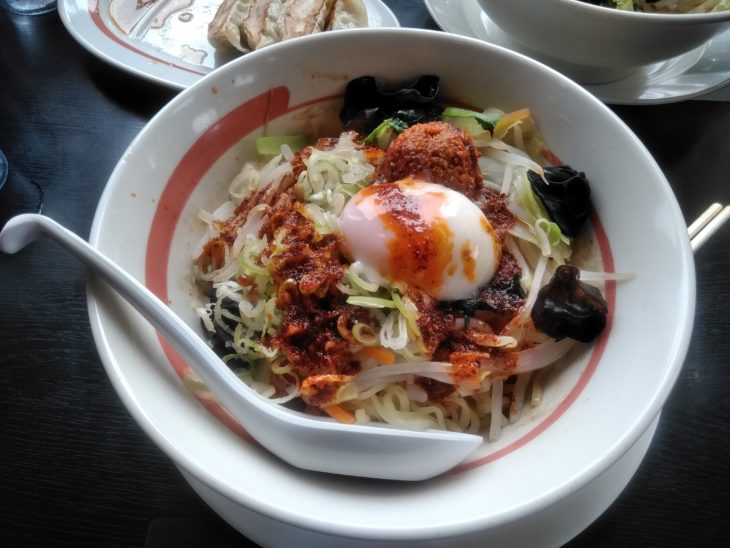 まずは、かみさんが注文したピリ辛系です。麺は通常のラーメンと同じ麺のようで、温かい麺での提供なのですばやくまぜます。具材は、辛し肉味噌、温泉玉子、きくらげ、もやし、たまねぎ、キャベツ、こまつ菜、ねぎ、にんじん、などです。野菜まぜめんというだけあって確かに野菜は多いですね。