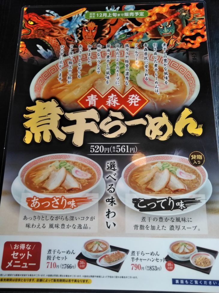 あっさり味とこってり味の2種類あるようです。早速食べに行きたいと思いますが、行かなければならないらーめん店が多くてまだ、行けていないです。今度の週末には訪問します。同じ青森煮干しラーメンのお店『おりいち泉』(閉店しました)が新規オープンした事もあり、そちらにも行かないとならななかったし、『丸源ラーメン』台湾ラーメンも魅力的でした。
