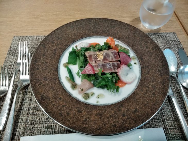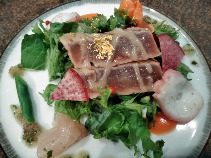 マグロ、タコ、サーモン、タイの海鮮と野菜。チーズのソースが美味しかったです。