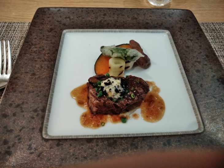 牛ヒレ肉は、小さめでしたが、美味しかったです。付け合わせはネギ、カボチャ、椎茸、ししとう天ですね。