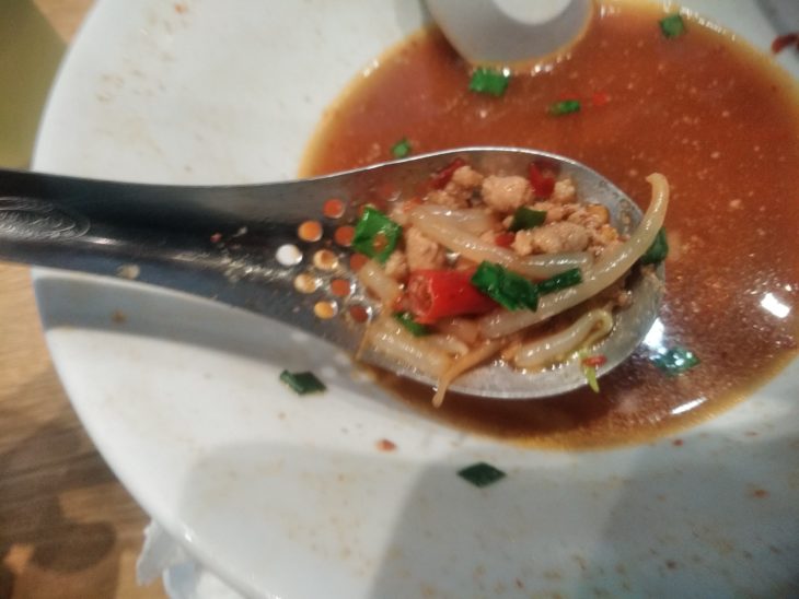 レンゲが2本ついています。1本はスープ用ですが、もう一本は、穴あきのレンゲです。これは、ミンチ肉・にら・もやしをスープからすくう時に使うんですね。これはうれしいサービスです。