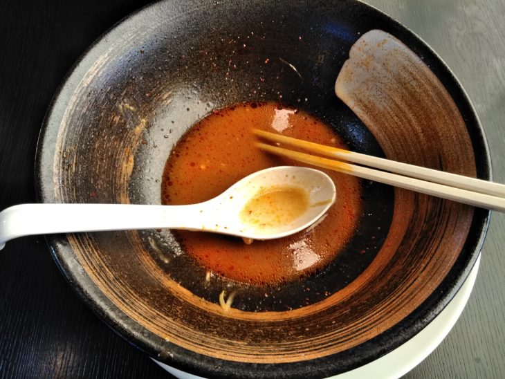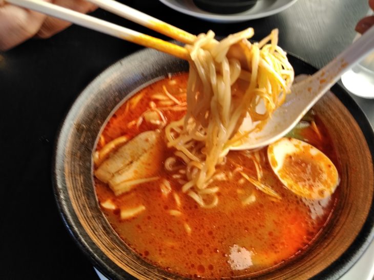 具材はチャーシュー2枚、煮玉子、メンマ、小松菜、白髪ねぎとマイルドと同じですね。スープはラー油&唐辛子?で辛さが強いですね。こちらもカレーらーめんなの?と感じられる位にカレー感がなかったですね。
