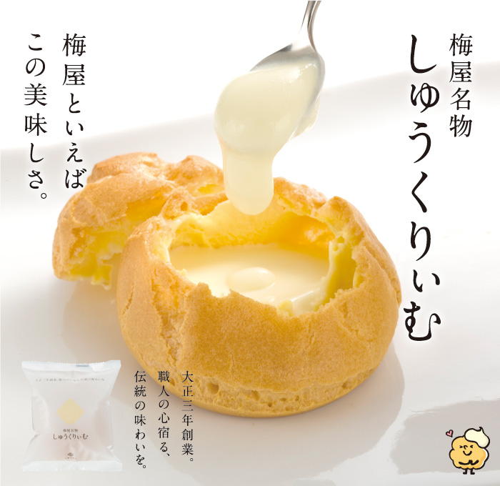 大正3年創業の菓子処「梅屋」が、独自の生しゅうくりぃむを造りはじめたのは、昭和39年の事。梅屋ならではの“とろけるような舌触り”は語り継がれた技と高度な職人技があっての味わいのよう