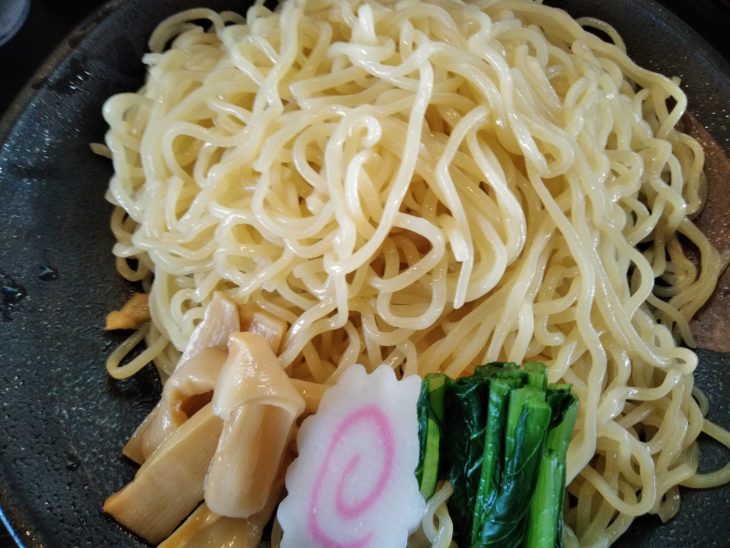 つけめんはほどよい酸味と辛味が合わさったコク旨さっぱりスープです。濃厚魚介つけめんは鰹節と昆布を使用していて魚介の旨味たっぷりの濃厚な味わいのスープですね。麺は中太の通常のらーめん用の麺と同じようですね。また、麺は冷たく、スープは温かいものが提供されます。具材は麺の上にはメンマ、鳴門、小松菜が添えられていてスープには刻んだチャーシューとネギが入っています。