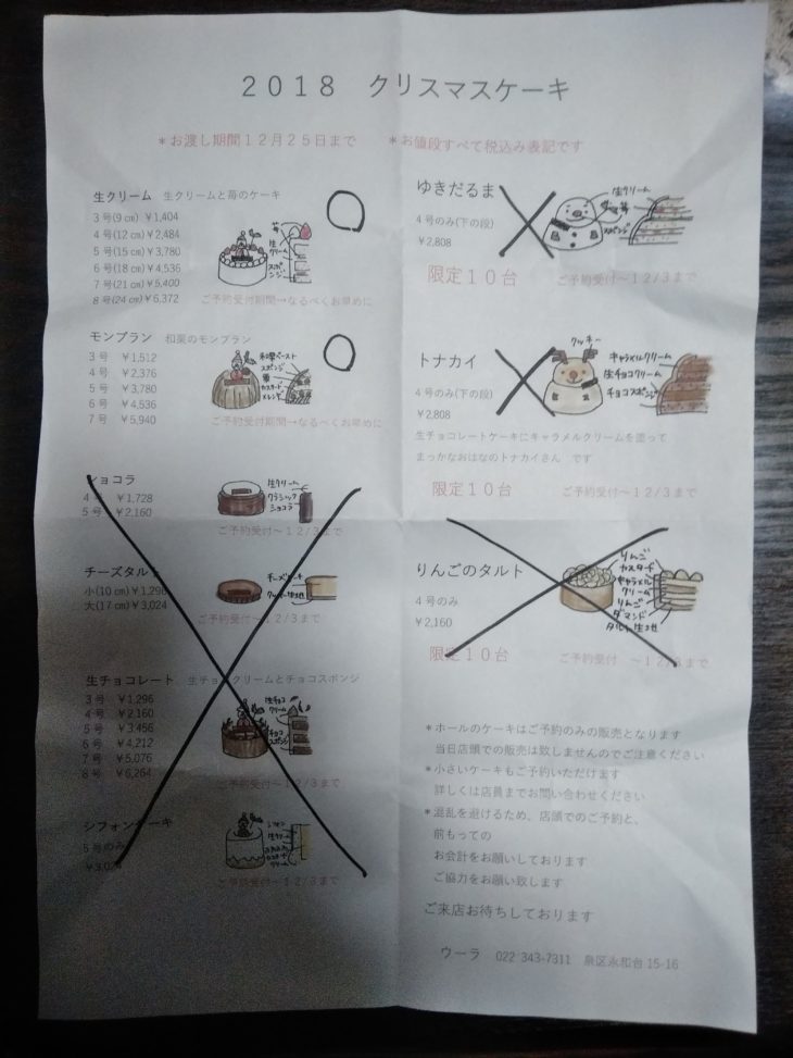 12月9日現在、2018年クリスマスケーキは、生クリームとモンブランのみ予約可能とのことです。他のケーキは数量限定で既に予約一杯だそうです。