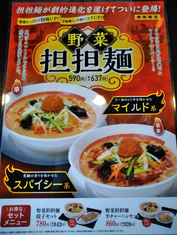 幸楽苑の野菜坦坦麺が劇的?進化を遂げて再登場したようなので紹介したいと思います。