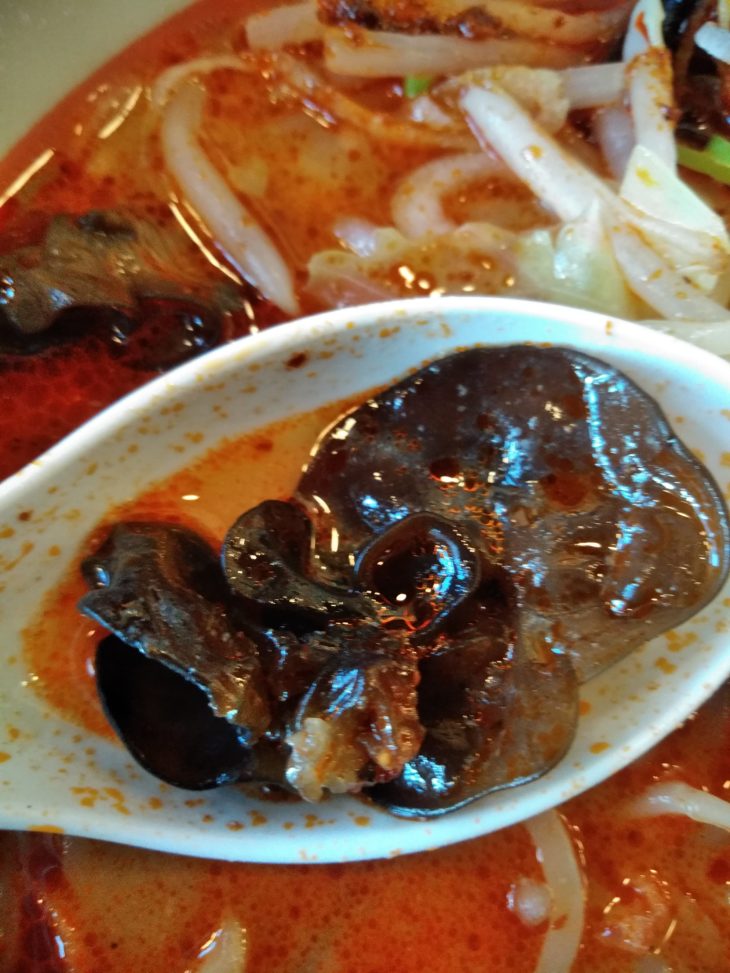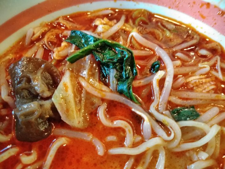 かみさんとふたりで来たら、2種類注文するのですが今回はひとりで訪問。私は辛いものが大好きなので当然「スパイシー系」を注文。見た目はそれほど辛そうではないですね。まずはスープから飲んでみましたが、ごまの風味が香るピリ辛で濃厚な味わいが美味しいですね。具材は、辛味噌ミンチ肉、きくらげ、もやし、キャベツ、ほうれん草、ねぎなどですね。
