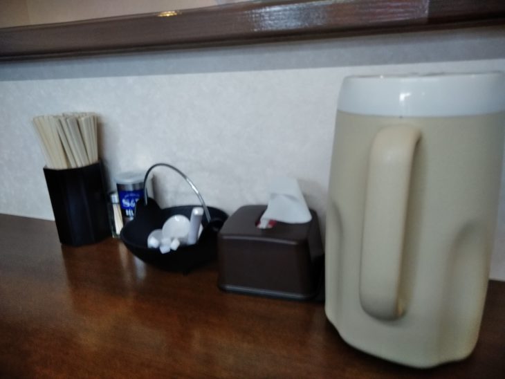 卓上には、こしょう、割り箸、爪楊枝、ティッシュ、水があるだけです。とてもシンプルです。