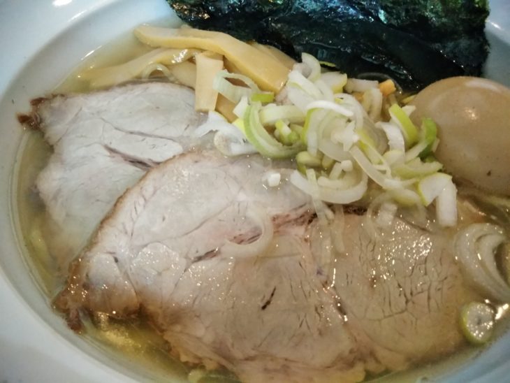 お店のおすすめは、「もみじのしおラーメン(あっさり)」、または「もみじのみそラーメン(こってり)」とのことです。今日は、しおラーメンを選択しました。注文して10分程で着丼しました。値段は900円と高めですが、具材は大きくて厚いチャーシューが2枚、煮玉子、メンマ、のり×3枚、ねぎが入っているので、高くはないですね。澄みきったしお味のスープはあっさりしていますが、とてもコクがあり、美味しいです。豚骨がメインらしいですが、私の好みの味ですね。
