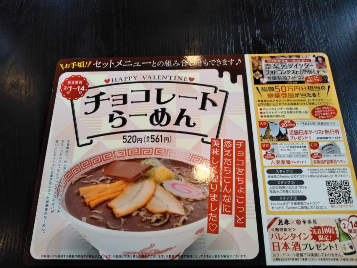 2月といえば、2/3日の節分の次は2/14バレンタインですよね。幸楽苑がバレンタインに向けてまたやってくれました。ひとつめは、バレンタインデーの初の企画として全国517店舗で「チョコレートらーめん」を発売した。14日までの期間限定で価格は税込み561円です。ふたつめは、2/14(木)限定で日本酒プレゼントされるようです。