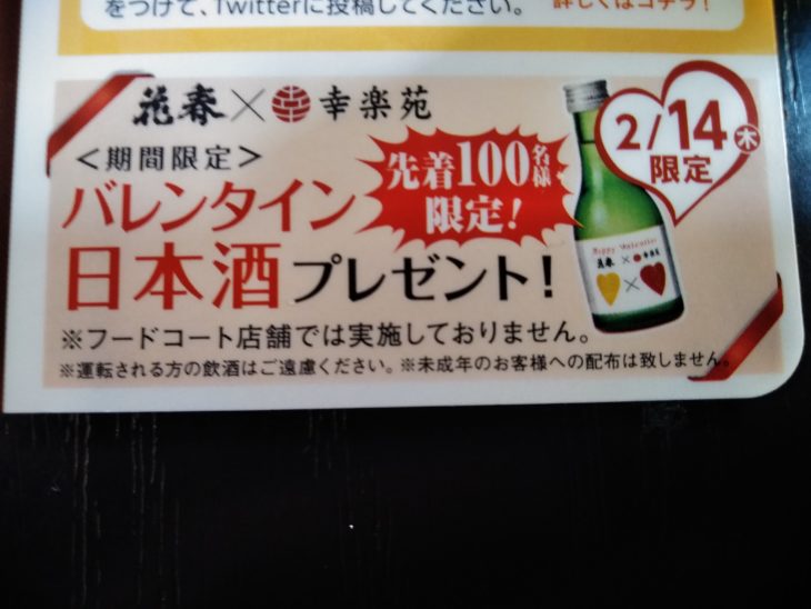 2/14(木)限定で、先着100名様にバレンタイン日本酒をプレゼントするそうです。
