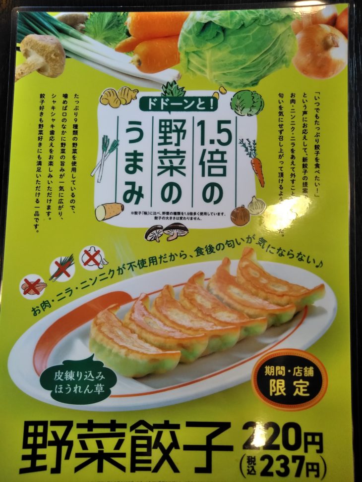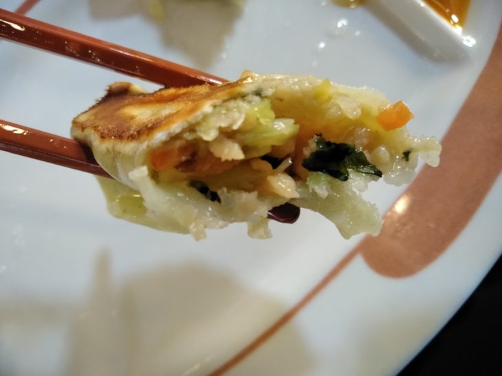この野菜餃子は、肉、ニラ、ニンニクが不使用なので食後のにおいが気になりません。また、9種類の野菜(たまねぎ、にんじん、キャベツ、ねぎ、山芋しいたけ、しそ、生姜、大豆)が入っているそうです。皮にはほうれん草が練り込まれているようなので、緑色になっています。