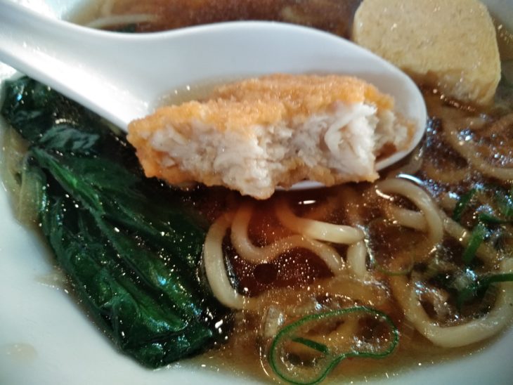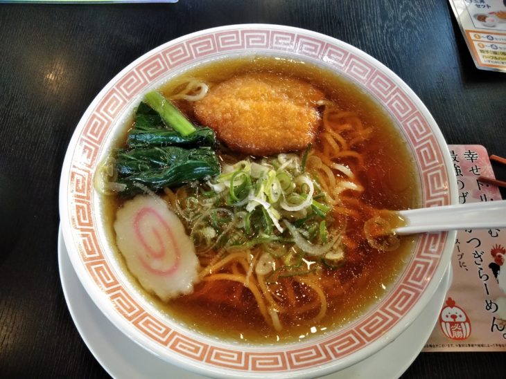 「あっさり通過(中華)そば」は、鶏のダシを使用したあっさりスープのしょうゆラーメンに、国産鶏を使用のチキンカツ、合格玉子焼き合格祈願の海苔、他の具材としては、ホウレン草、ナルト、ネギがトッピングされているようです。