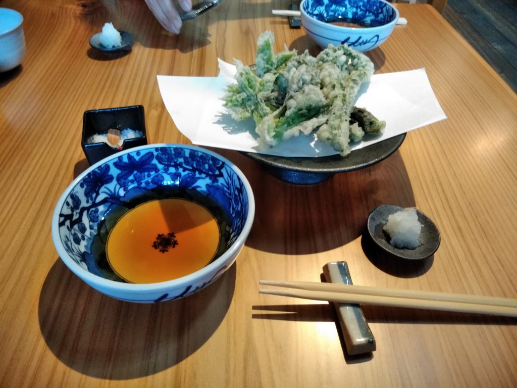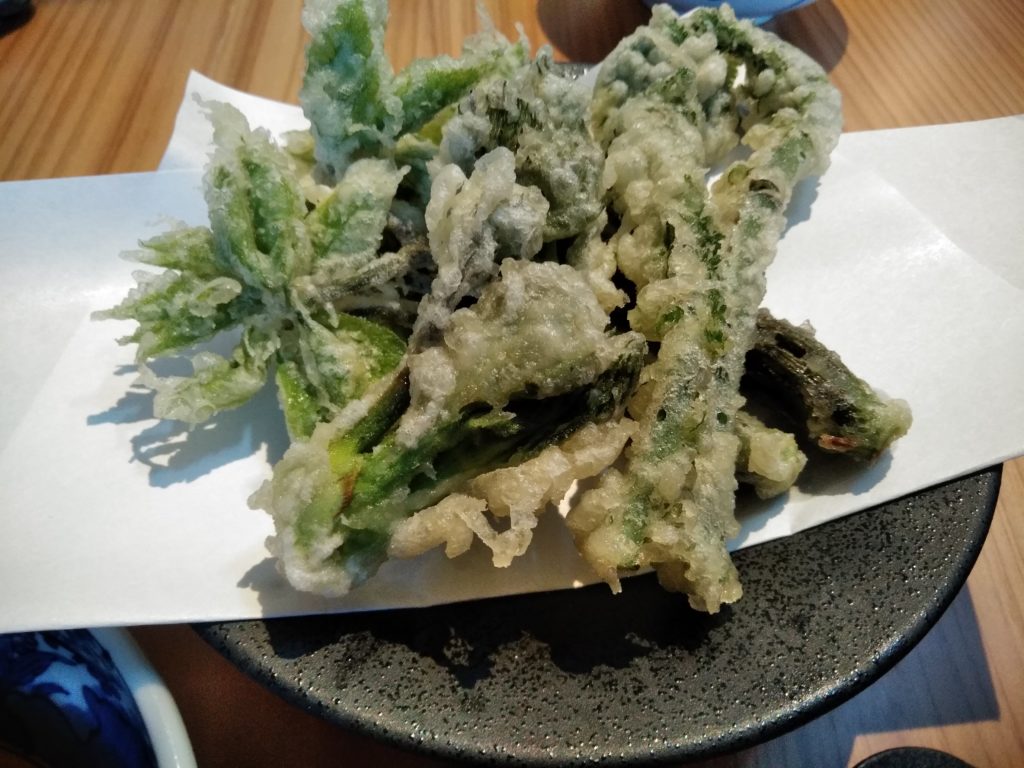 今回は、会津山都そばの美味しさを堪能したかったので、私は、ざるそば(800円)、かみさんは、冷やしとろろ(900円)、本日のとれたての山菜てんぷら(800円)が美味しそうだったので注文しました。最初に山菜てんぷらが来ました。タラノメ、こごみ、コシアブラのてんぷらでした。旬の物なので、とっても美味しかったです。