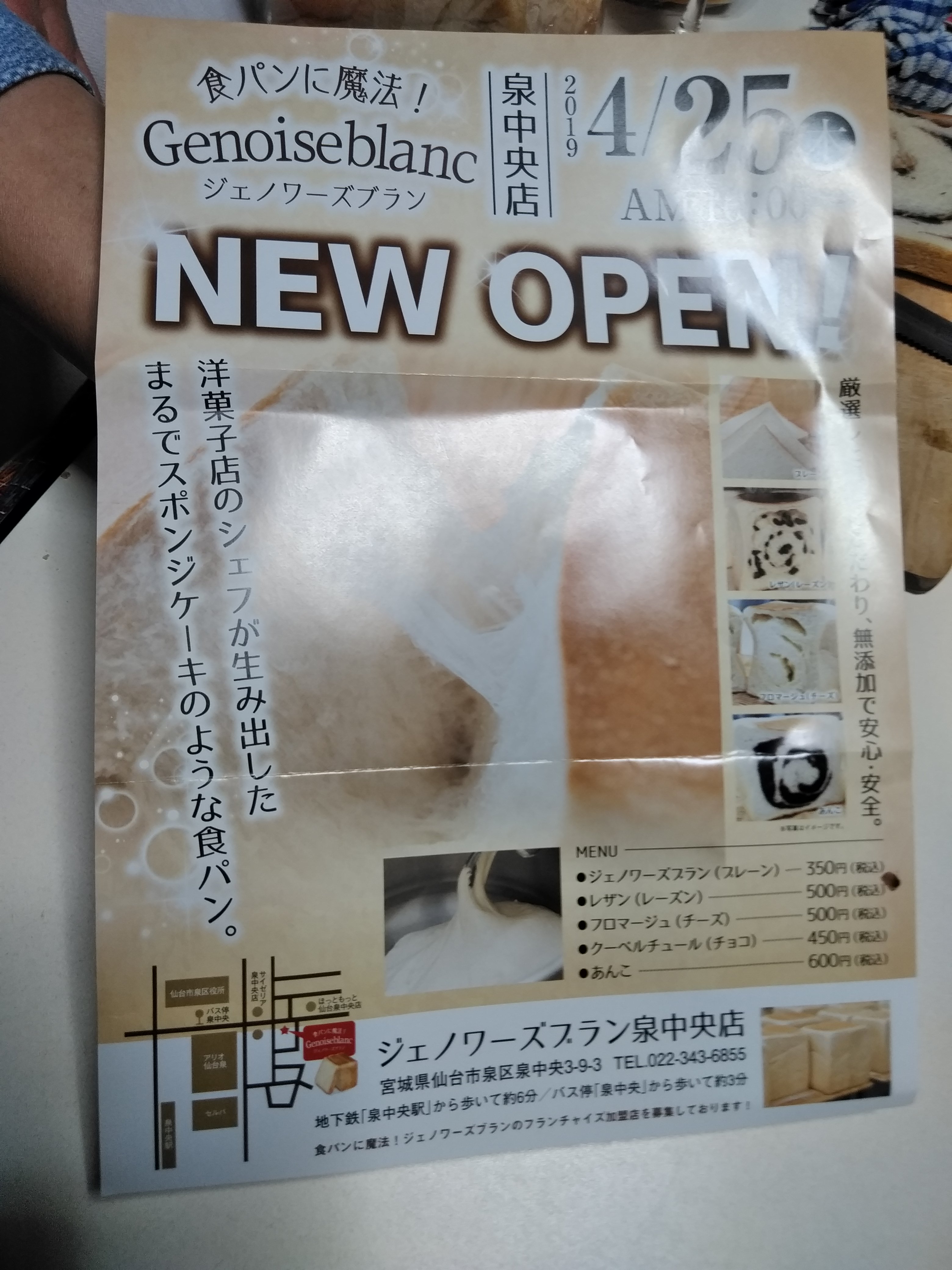 食パンに魔法?ジェノワーズブラン泉中央店が4/25(木)にオープンしました。この店は、食パン専門店で大和町店につづいて2店舗目ですね。早速行ってみたのでレポートしたいと思います。
