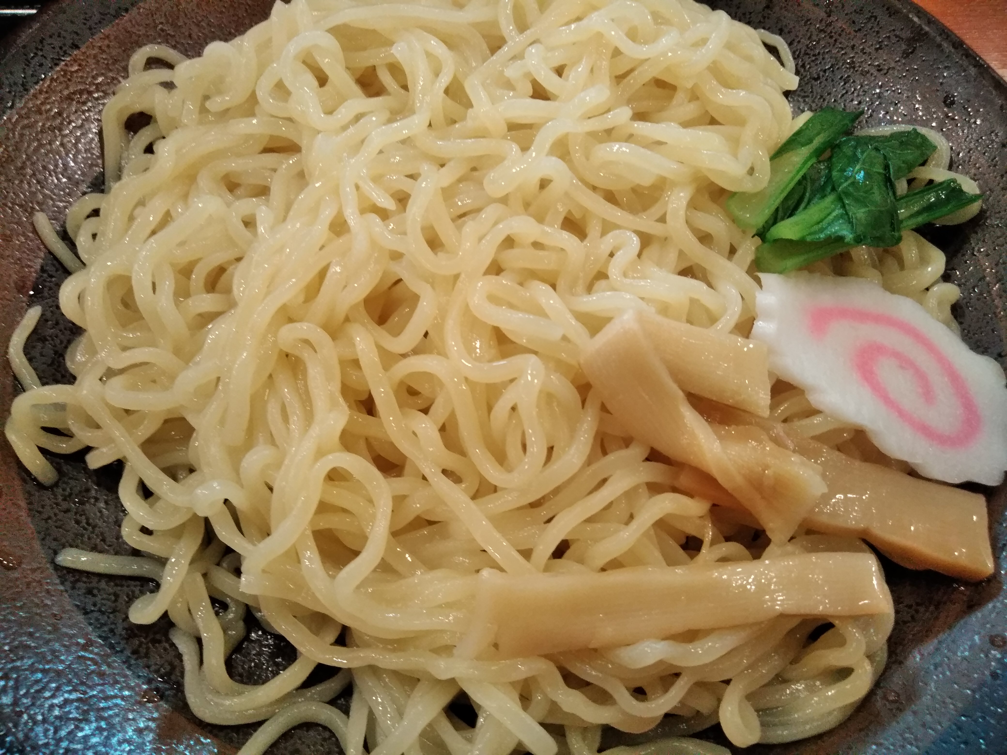 麺は大盛り(1.5倍)ですね。小盛(580円)もあるようですが、大盛でもそんなに多いとは感じませんでした。中太の冷たい麺で、具はメンマ・こまつ菜・なるとですね。