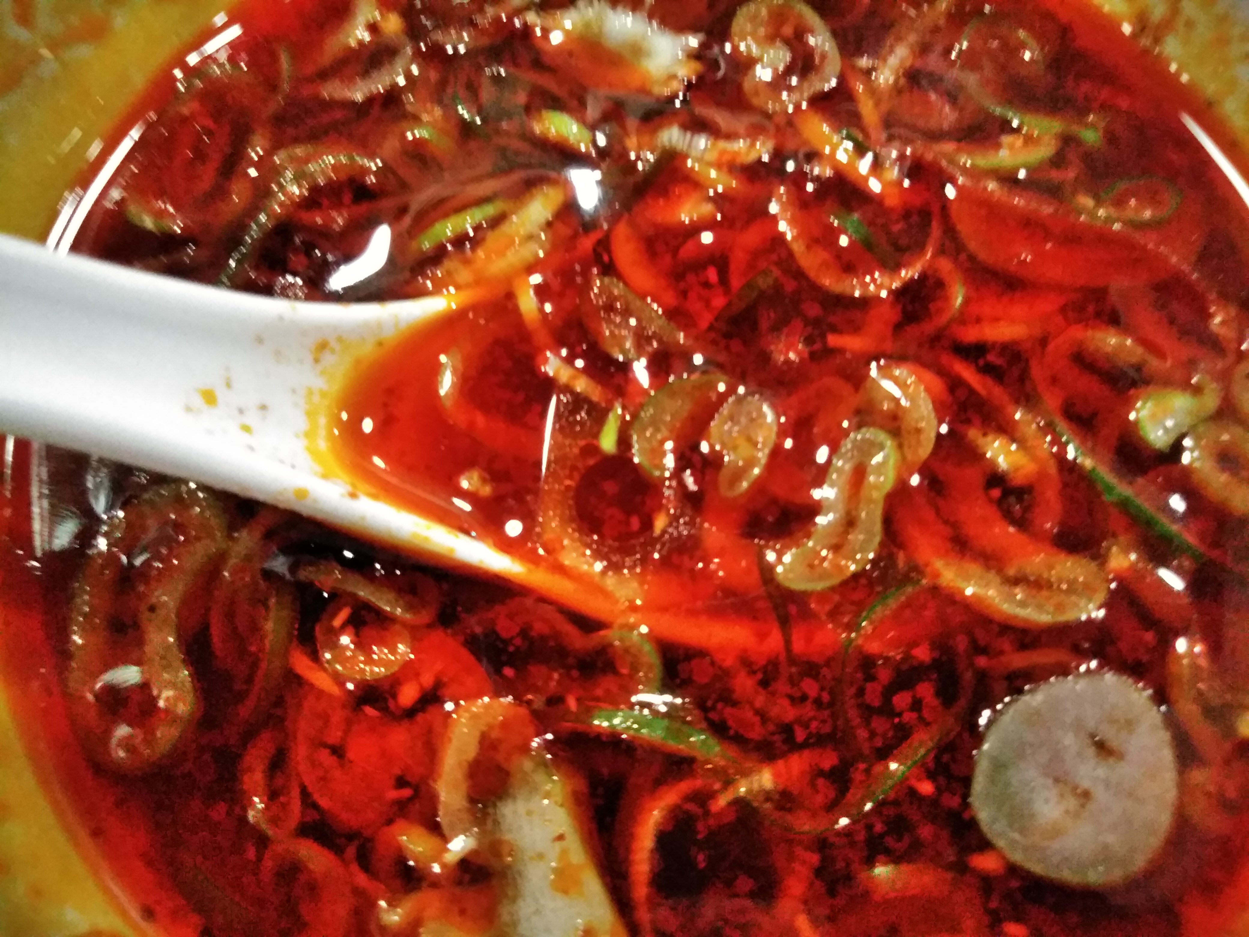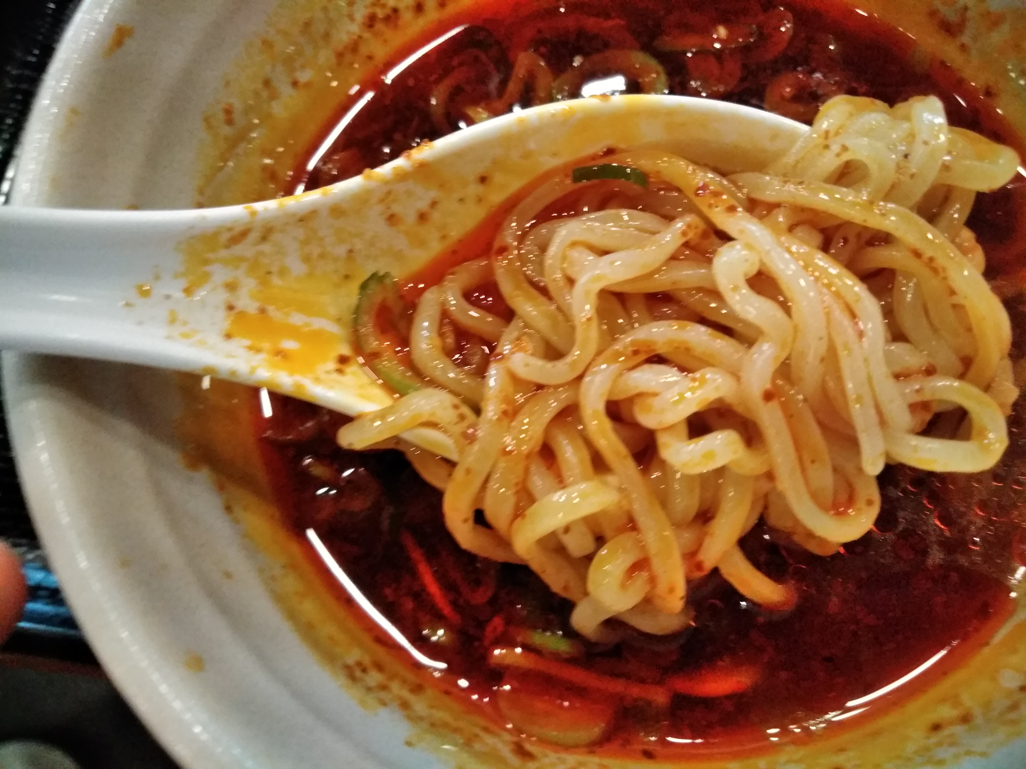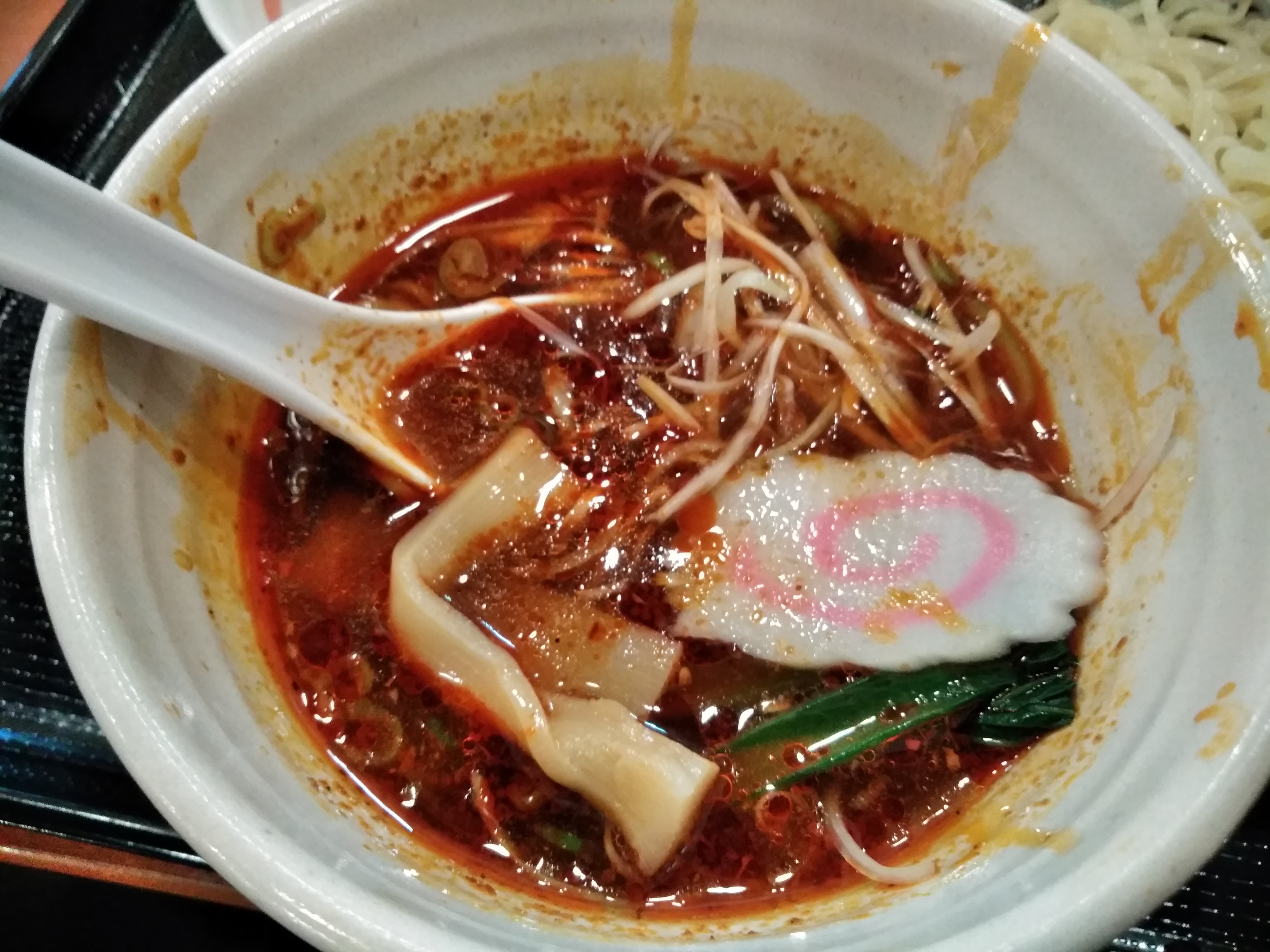 麺をつけ汁につけるとこんな感じになりますが、辛いもの大好きな私でも最初はちょっと辛過ぎる?と感じました。しかし、食べ進めるうちにこの辛さが、癖になるというか、やみつきになるというか美味しく感じられました。辛いのが苦手な方にはおすすめしませんが、私は嵌りそうです。