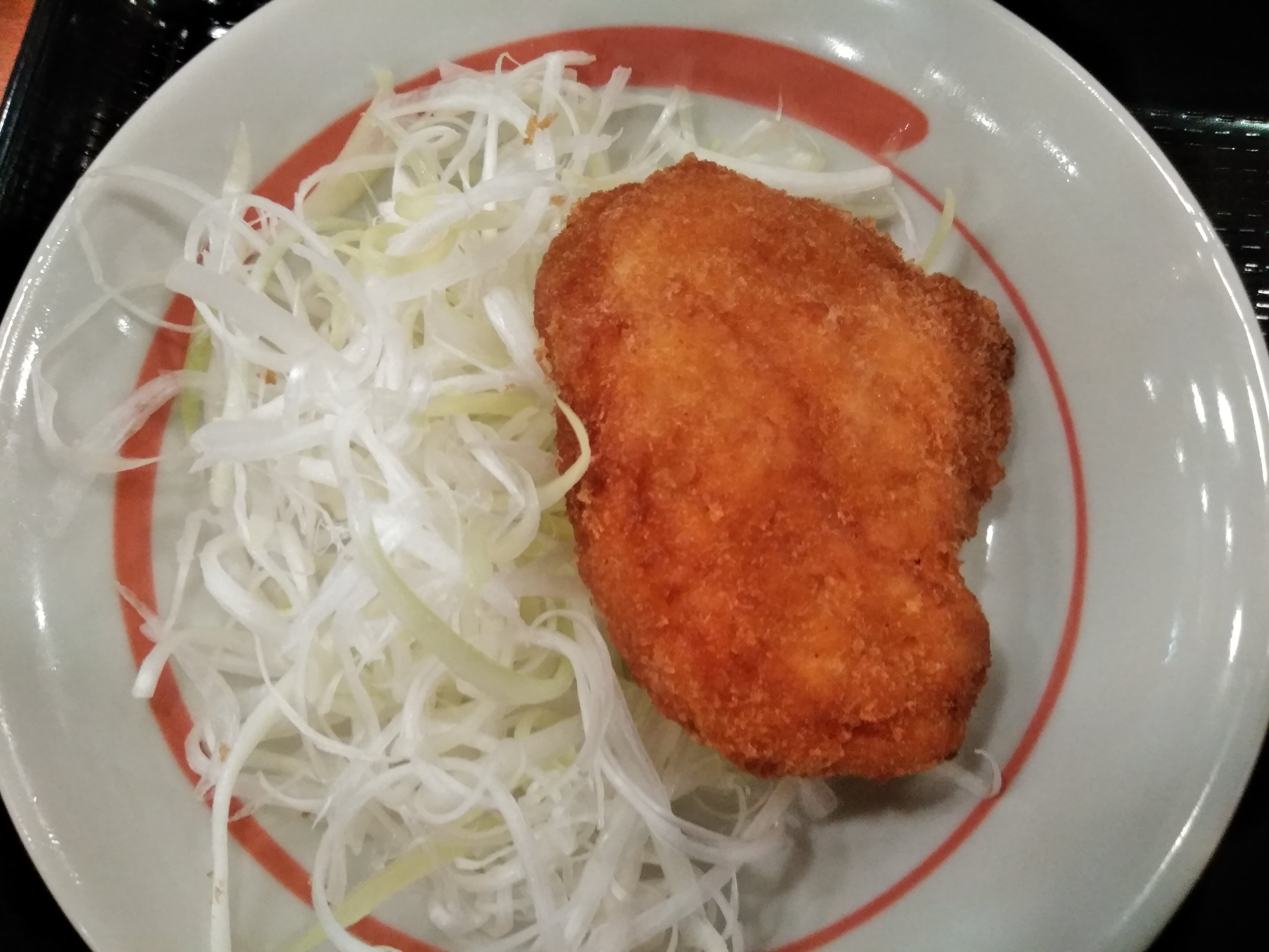 チキンカツは思ったより小さかったですが、揚げたてのようで温かかったです。付け合わせは、チラシではキャベツに思えましたが、実際は白髪ネギでした。