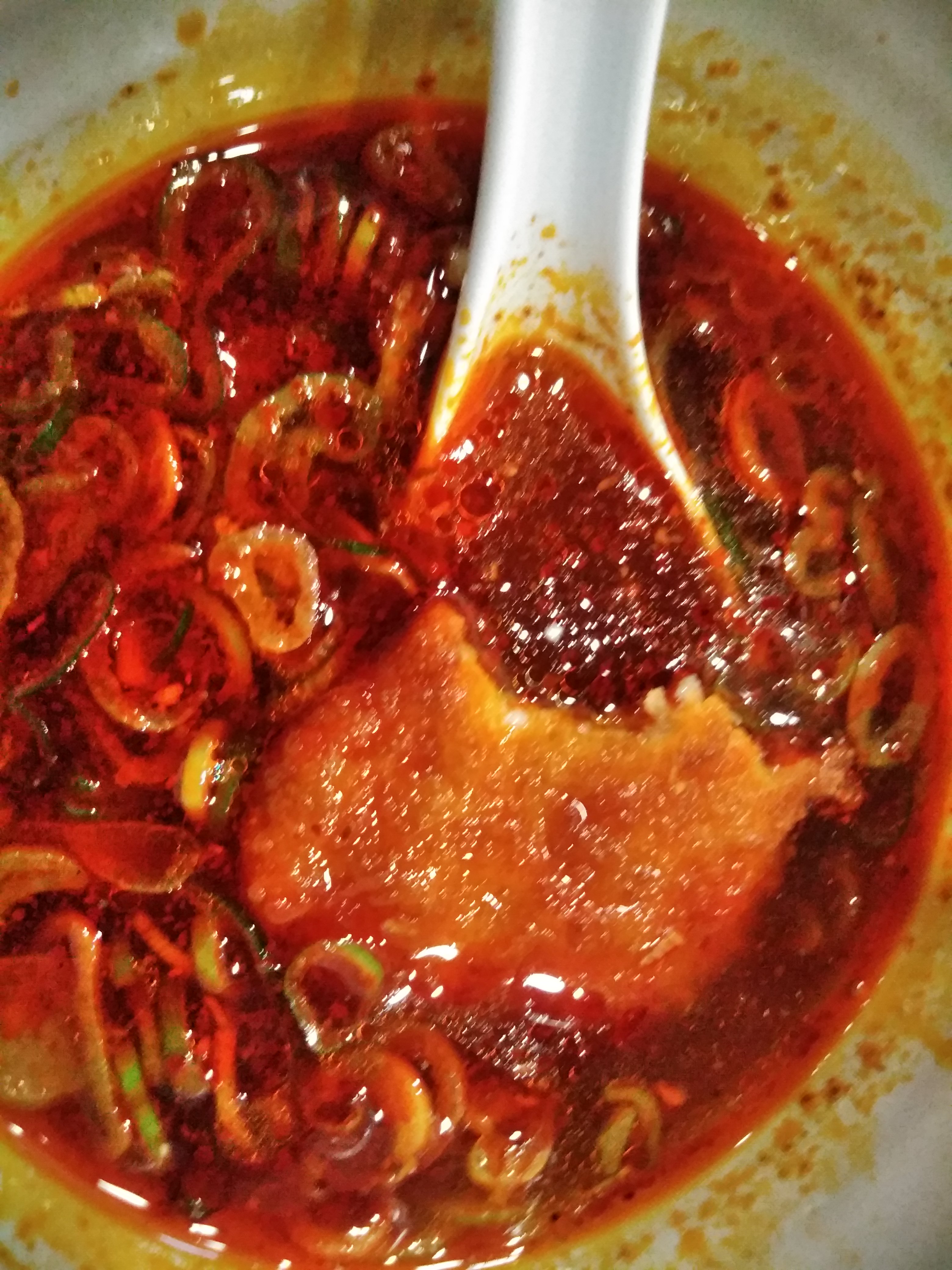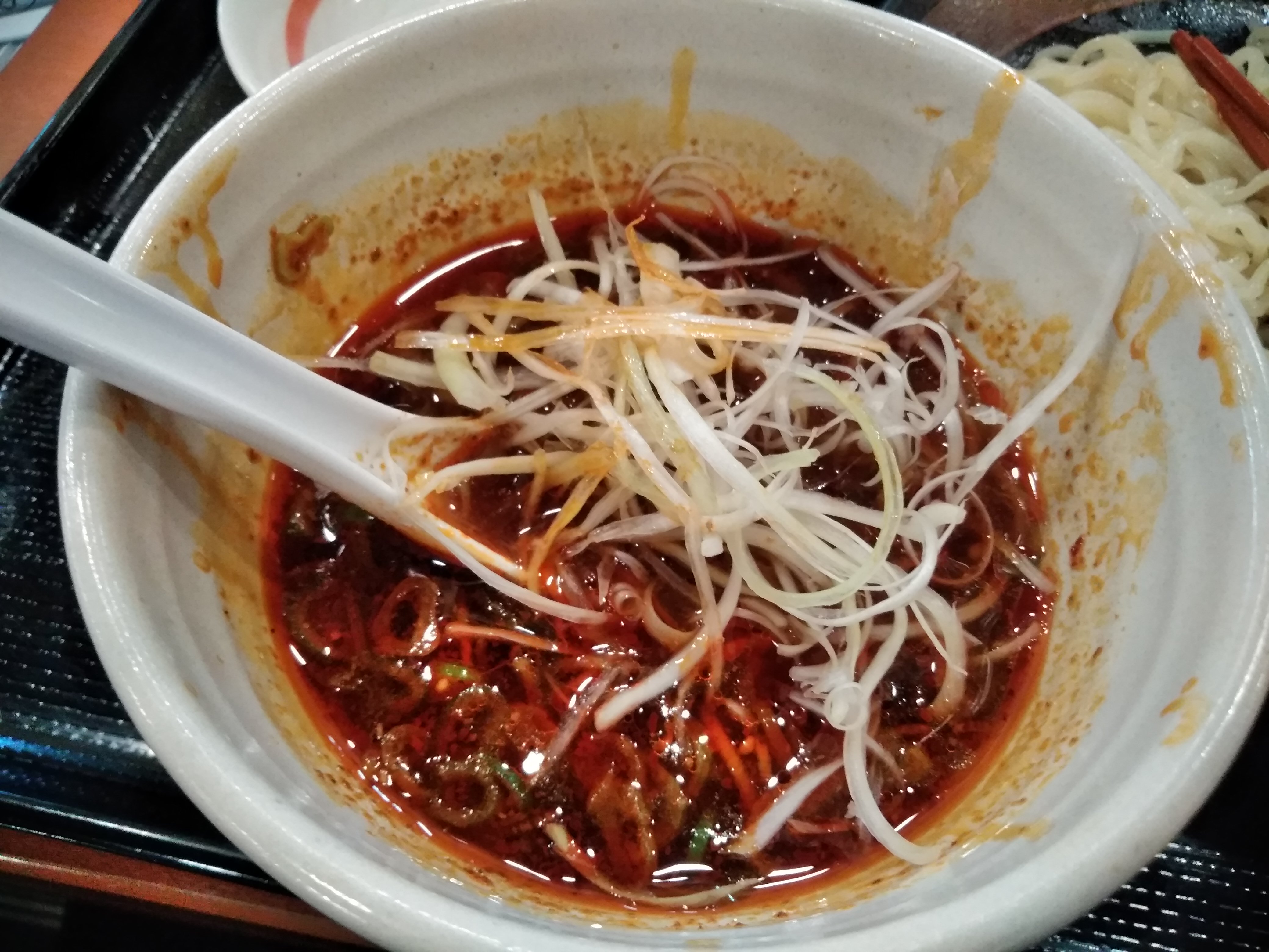 激辛つけめんのつけ汁です。見るからに辛そうですね。ネギもたっぷり入っています。