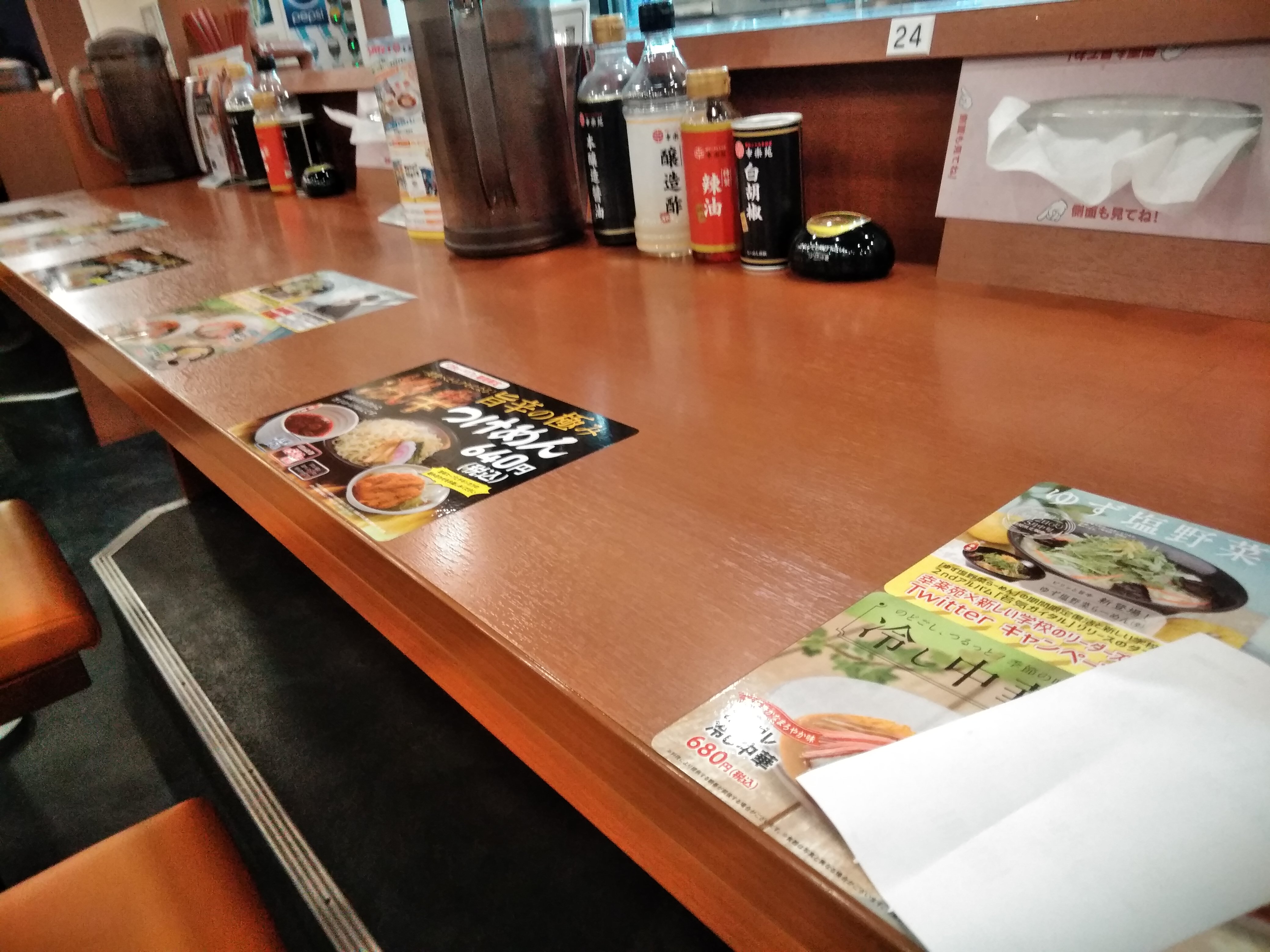 お店は平日の夜7時30分頃なのに、かなり混み合っていたので、一人の客はカウンター席に案内され座りましたが、席には『激辛つけめん』のチラシが貼ってありました。