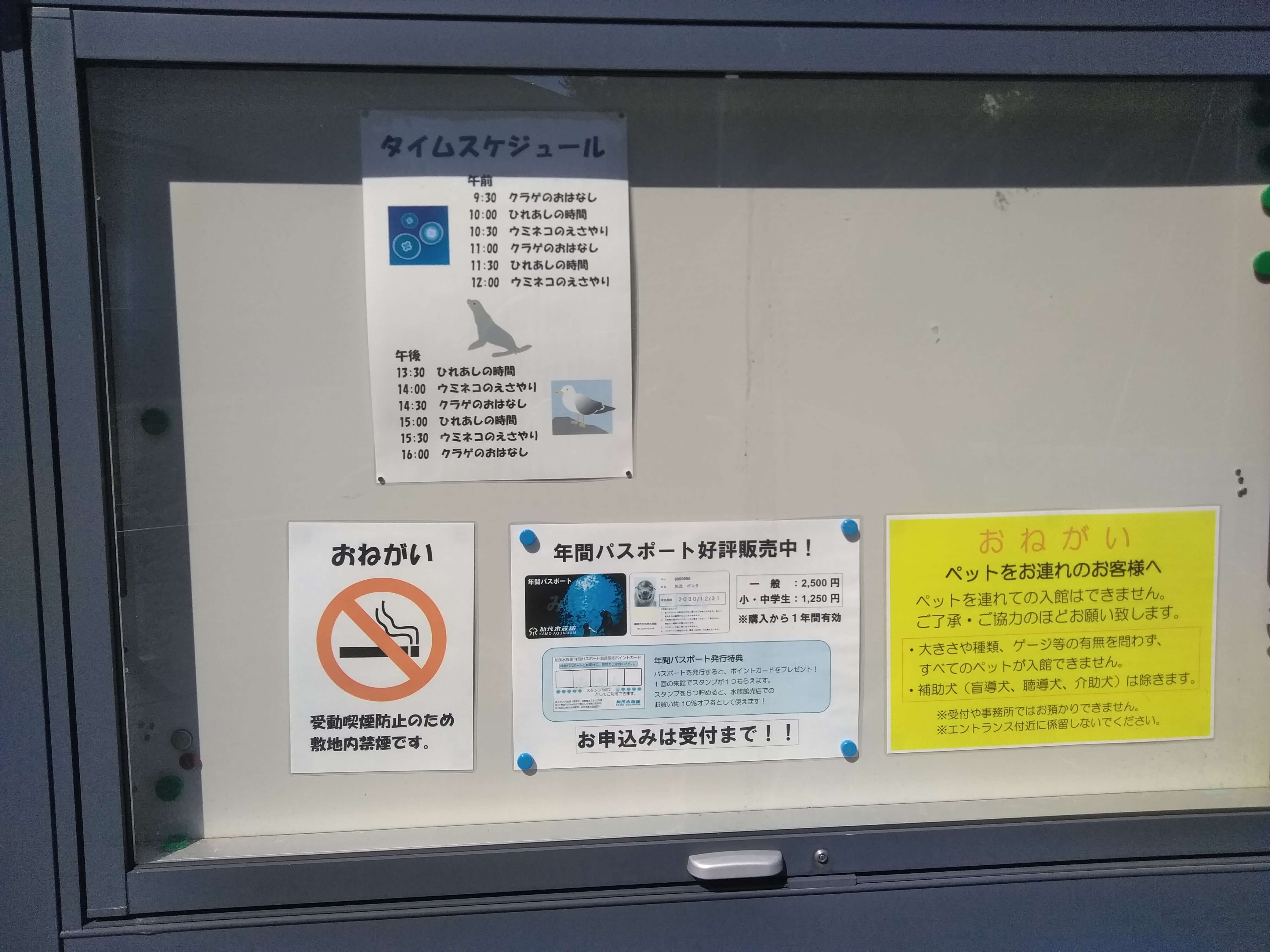 掲示板にはえさやり等のタイムスケジュールが掲示されています。
