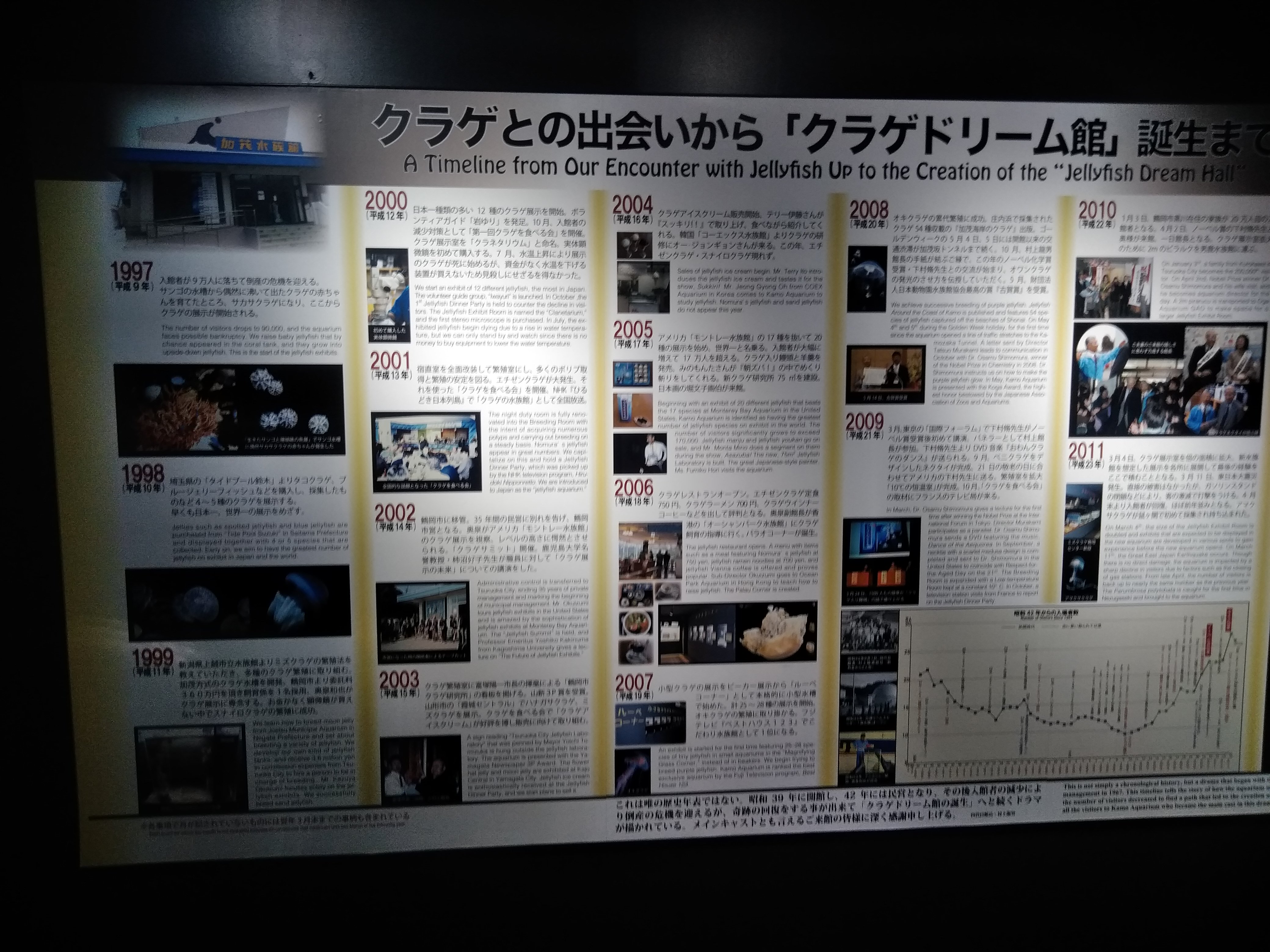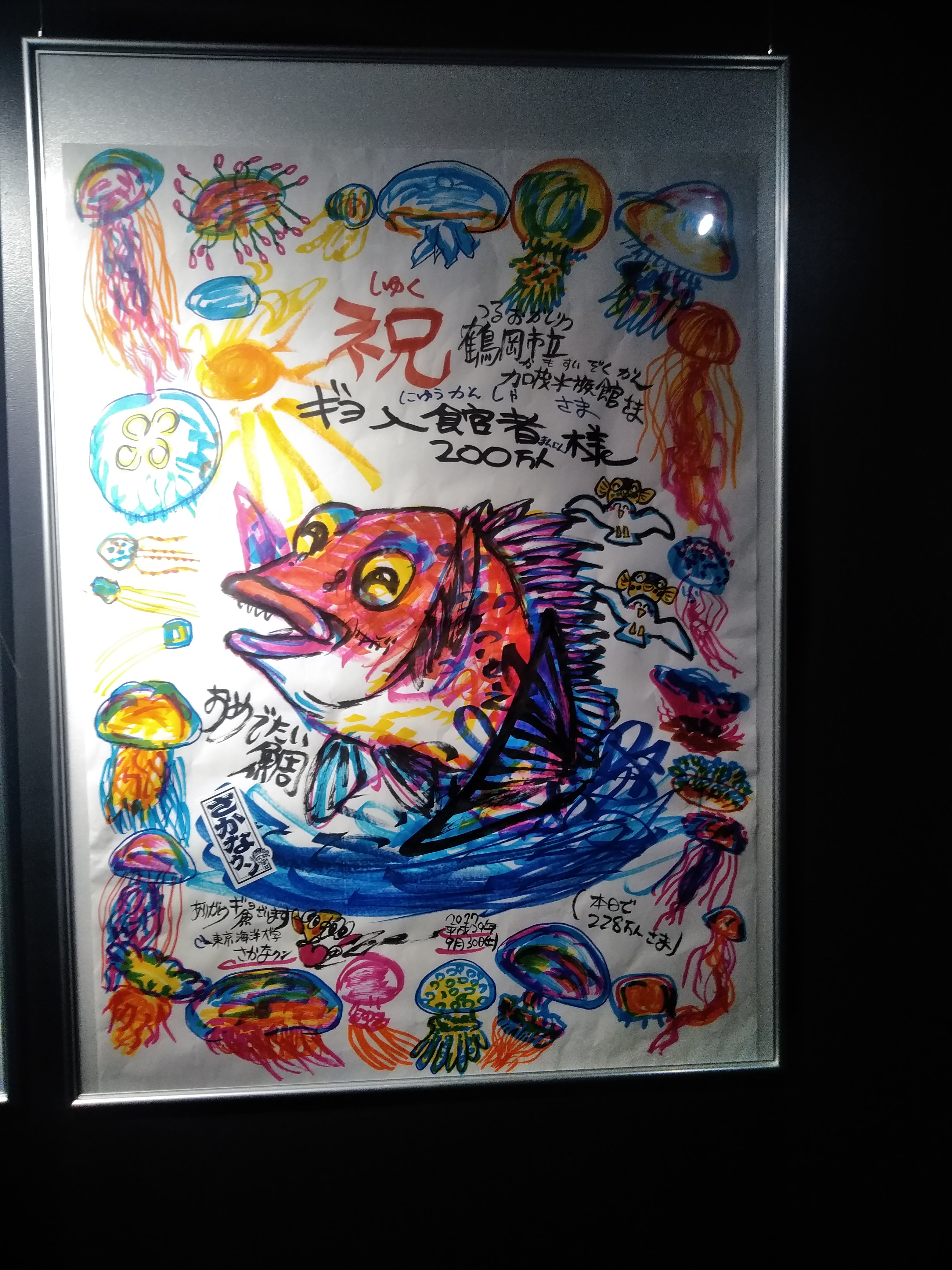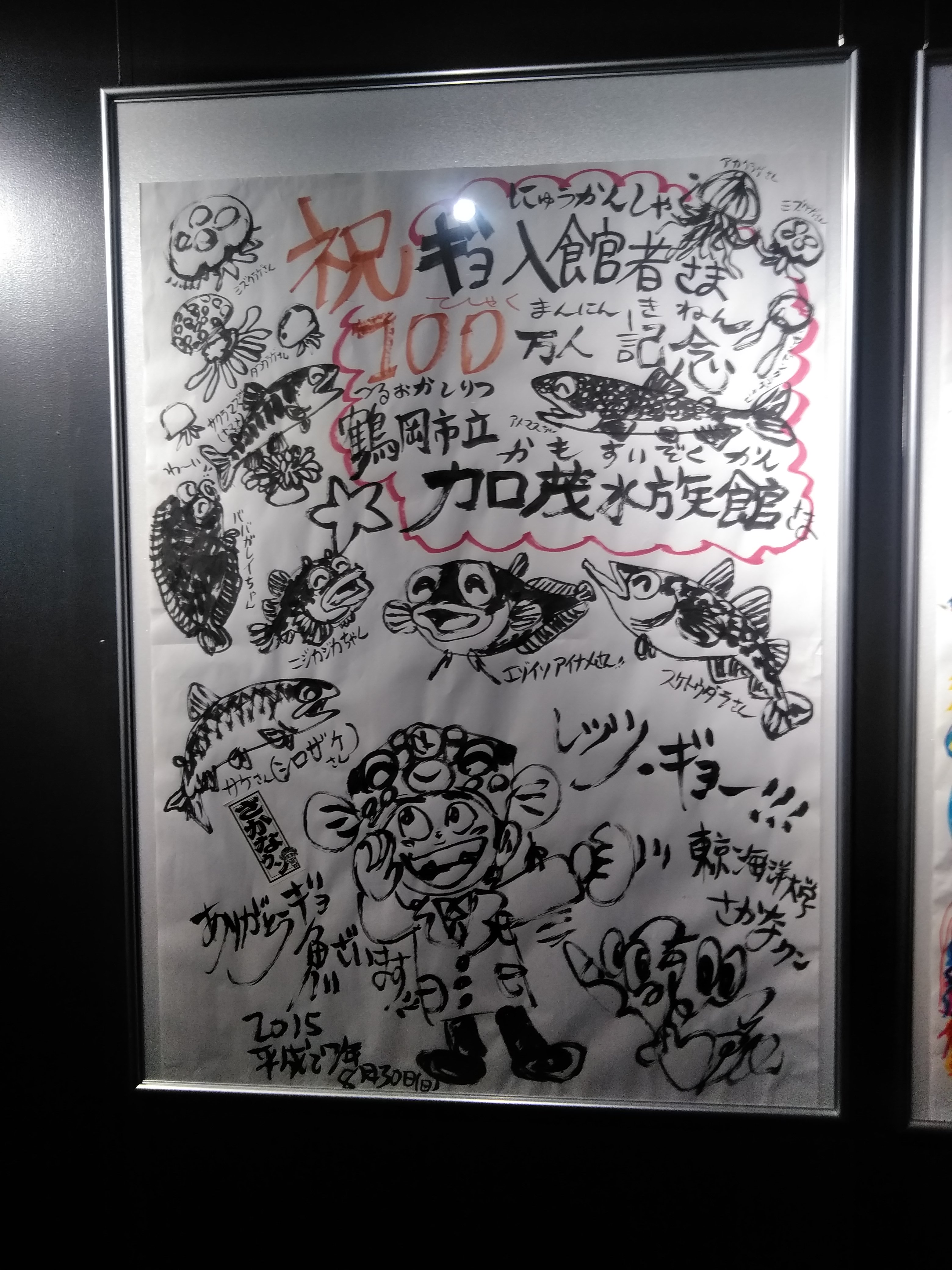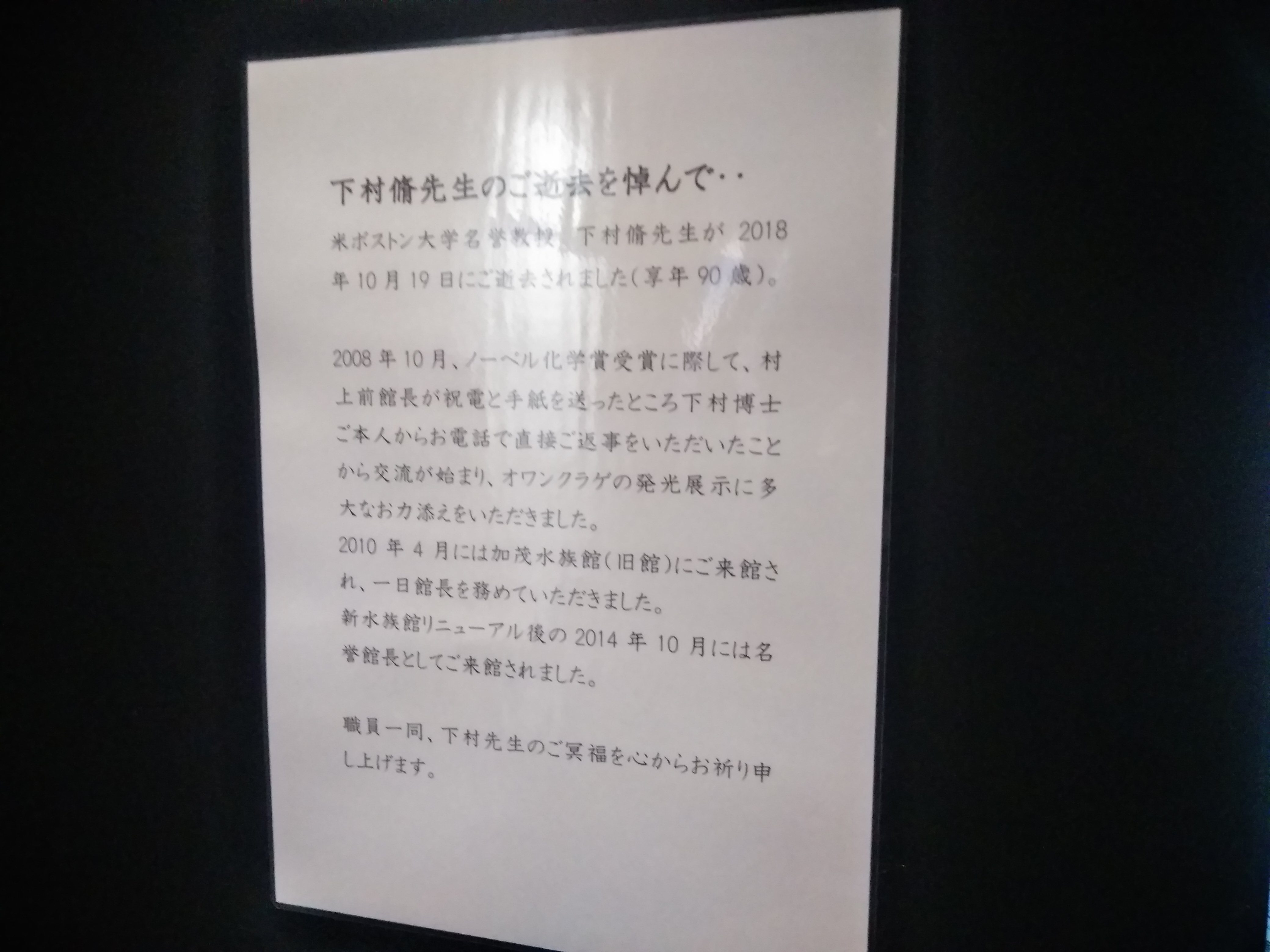 2008年に下村脩先生が、水中で光る「オワンクラゲ」の蛍光たんぱく質の研究で、ノーベル賞を受賞されました。その時に日本で「オワンクラゲ」を飼育展示していたのが、加茂水族館しかなく、入館者がどっと押し寄せたとのことです。村上館長が面識もないのに、祝電とお手紙を差し上げたのが縁で、2010年4月に来館頂き、一日館長を務めて頂きました。また、リニューアル後の2014年10月には名誉館長として、再度、来館頂きました。
