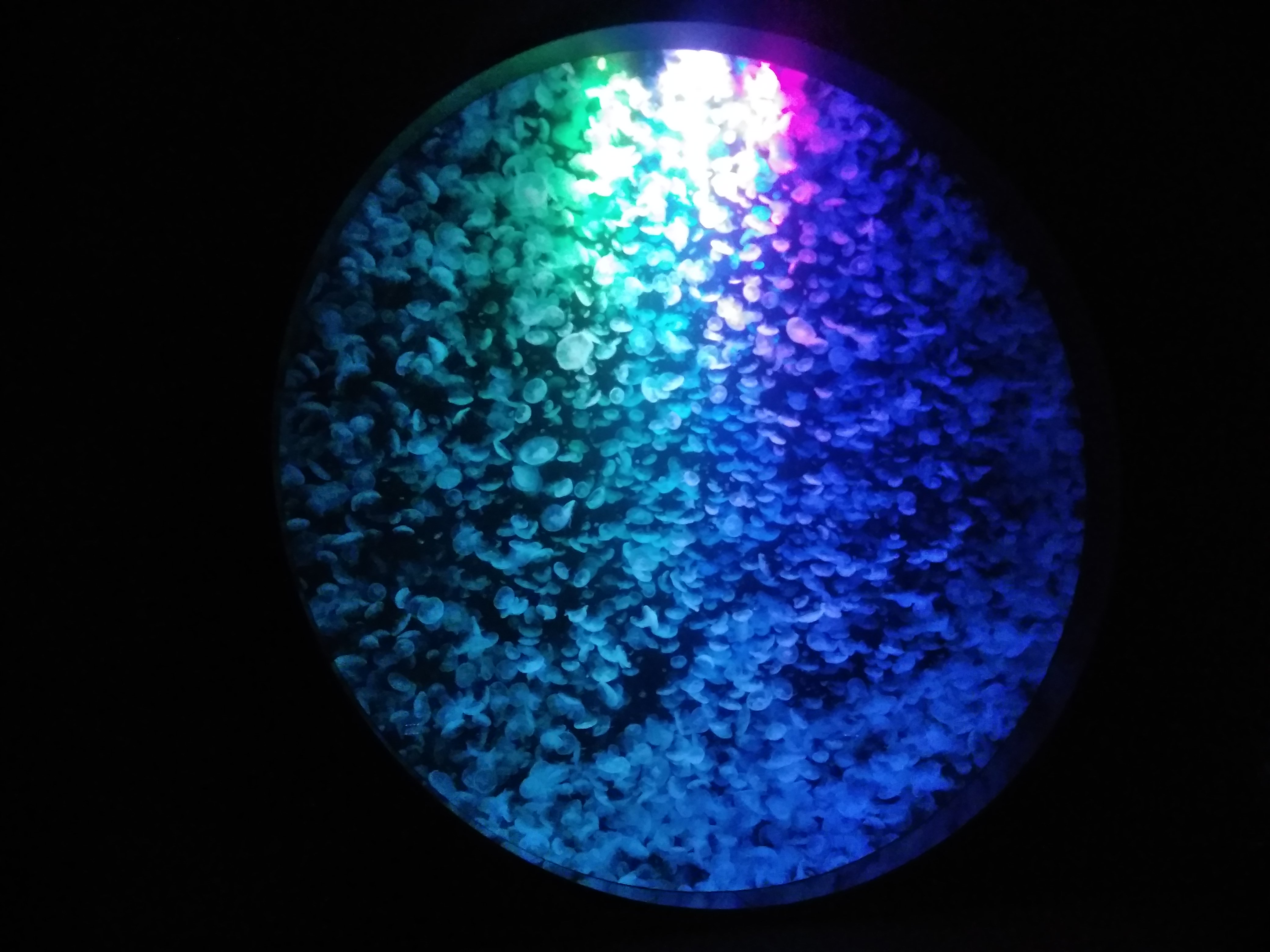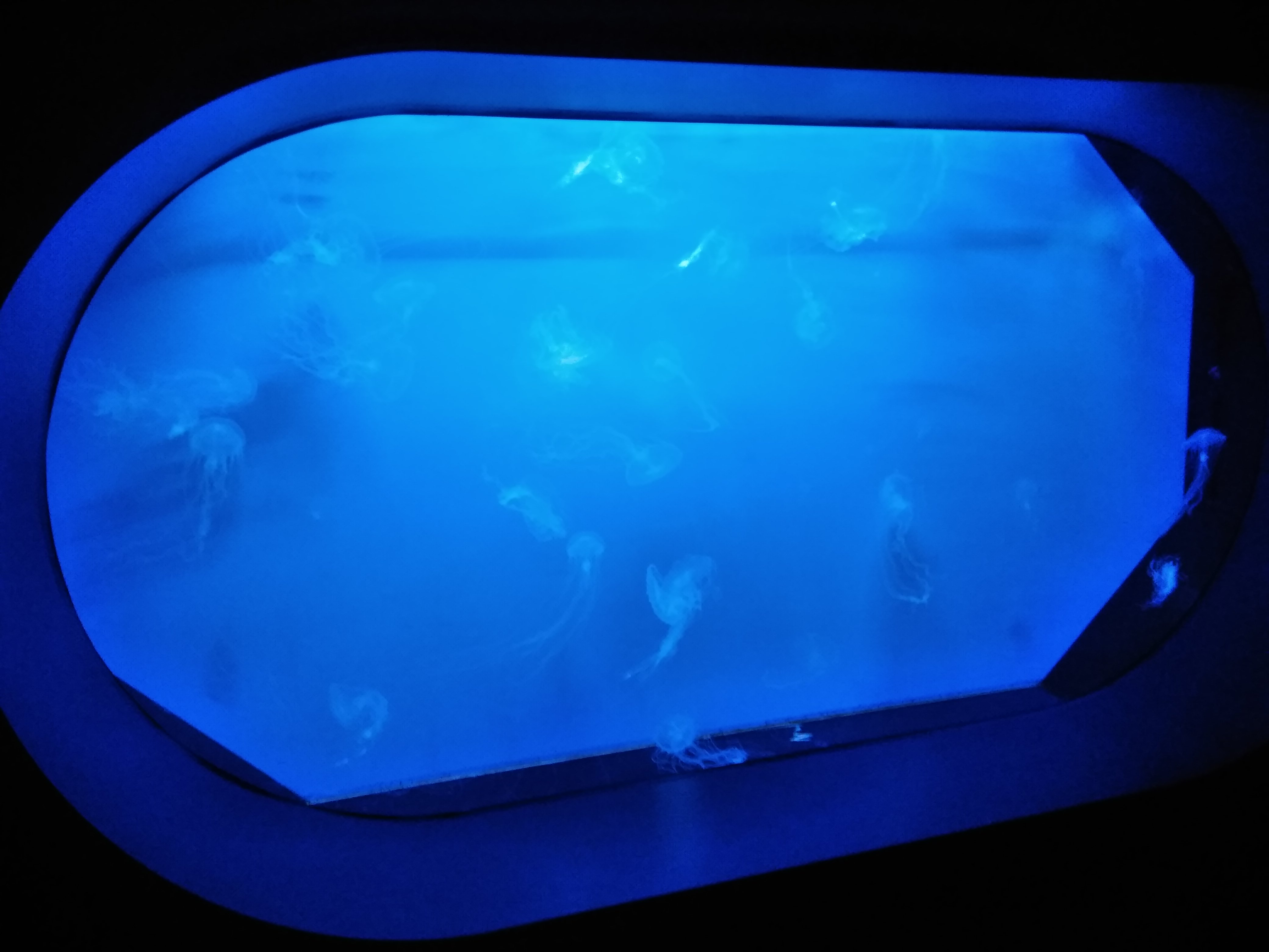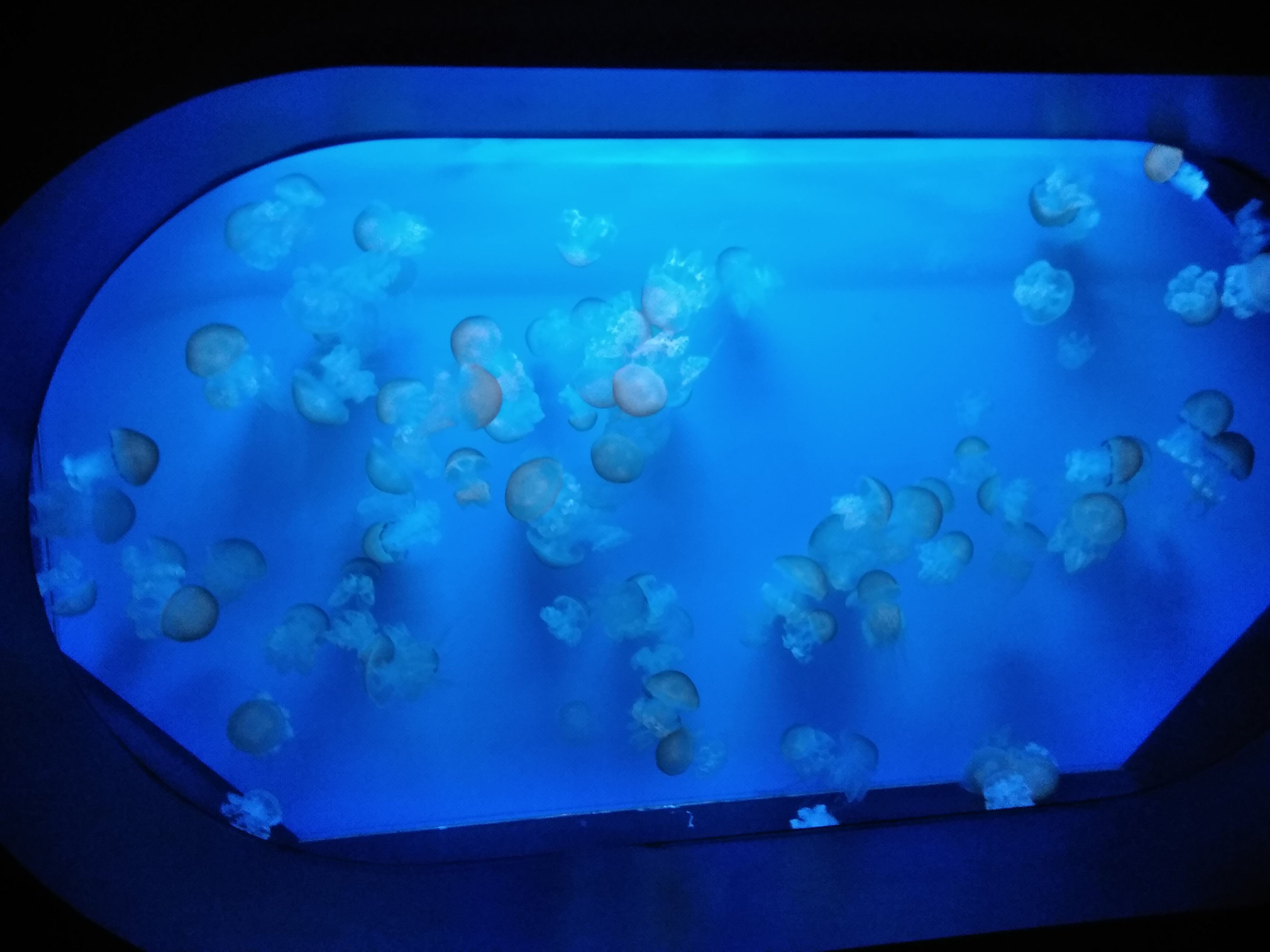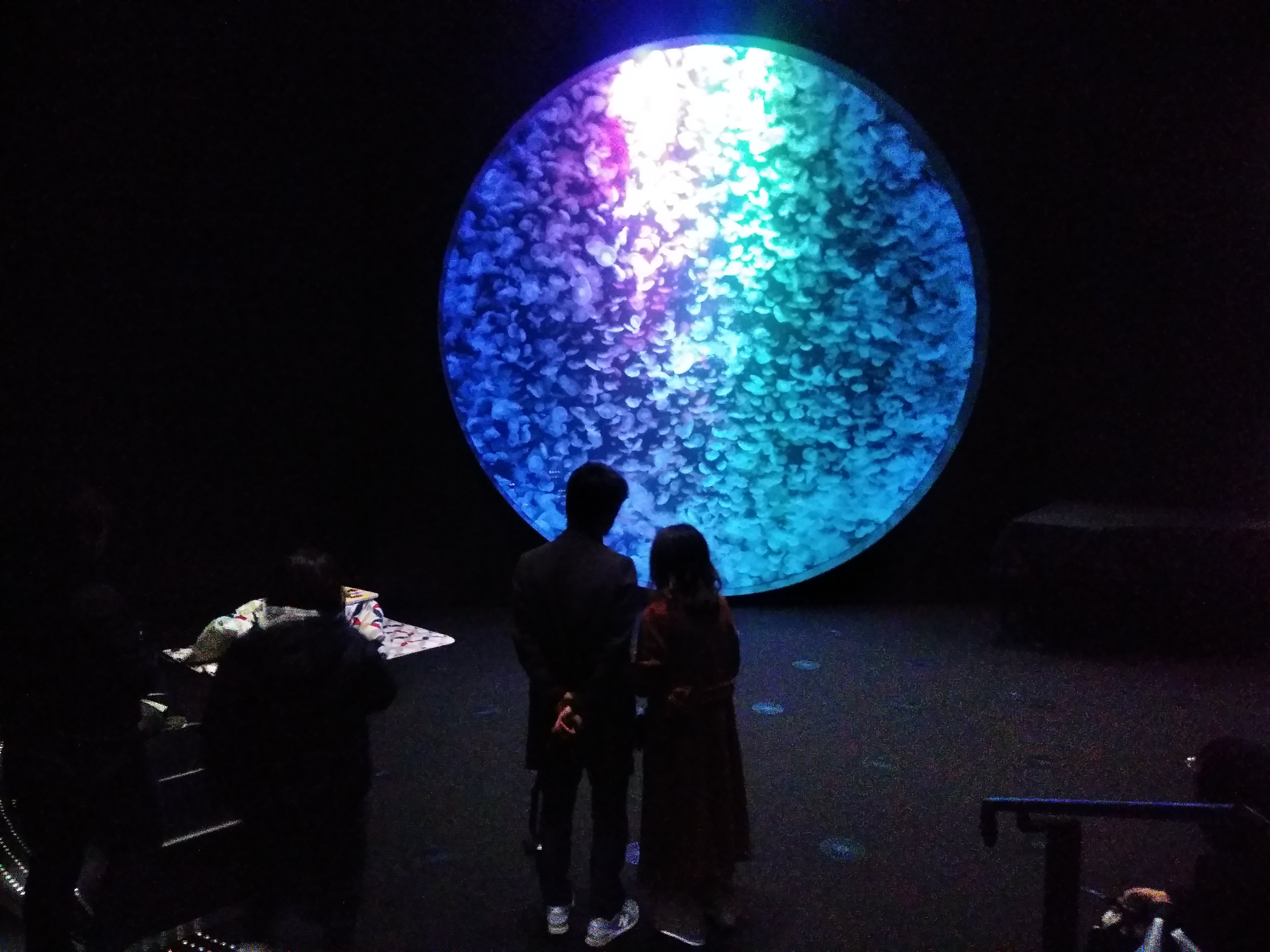 クラネタリウムの最大の見どころは世界に誇る、直径5 メートルの水槽「クラゲドリームシアター」に浮遊する約1万匹のミズクラゲです。凄いですね。感動的ですね。