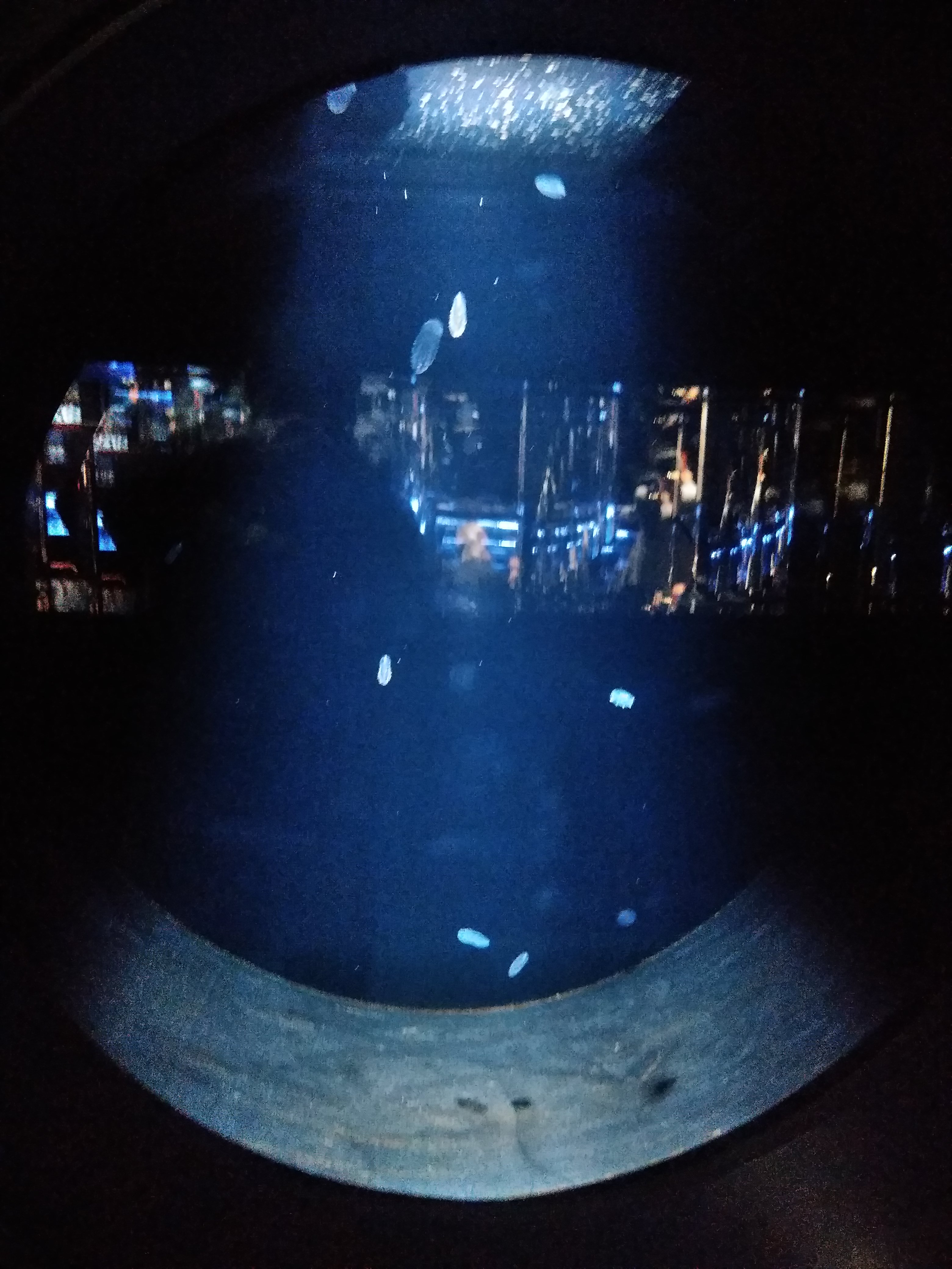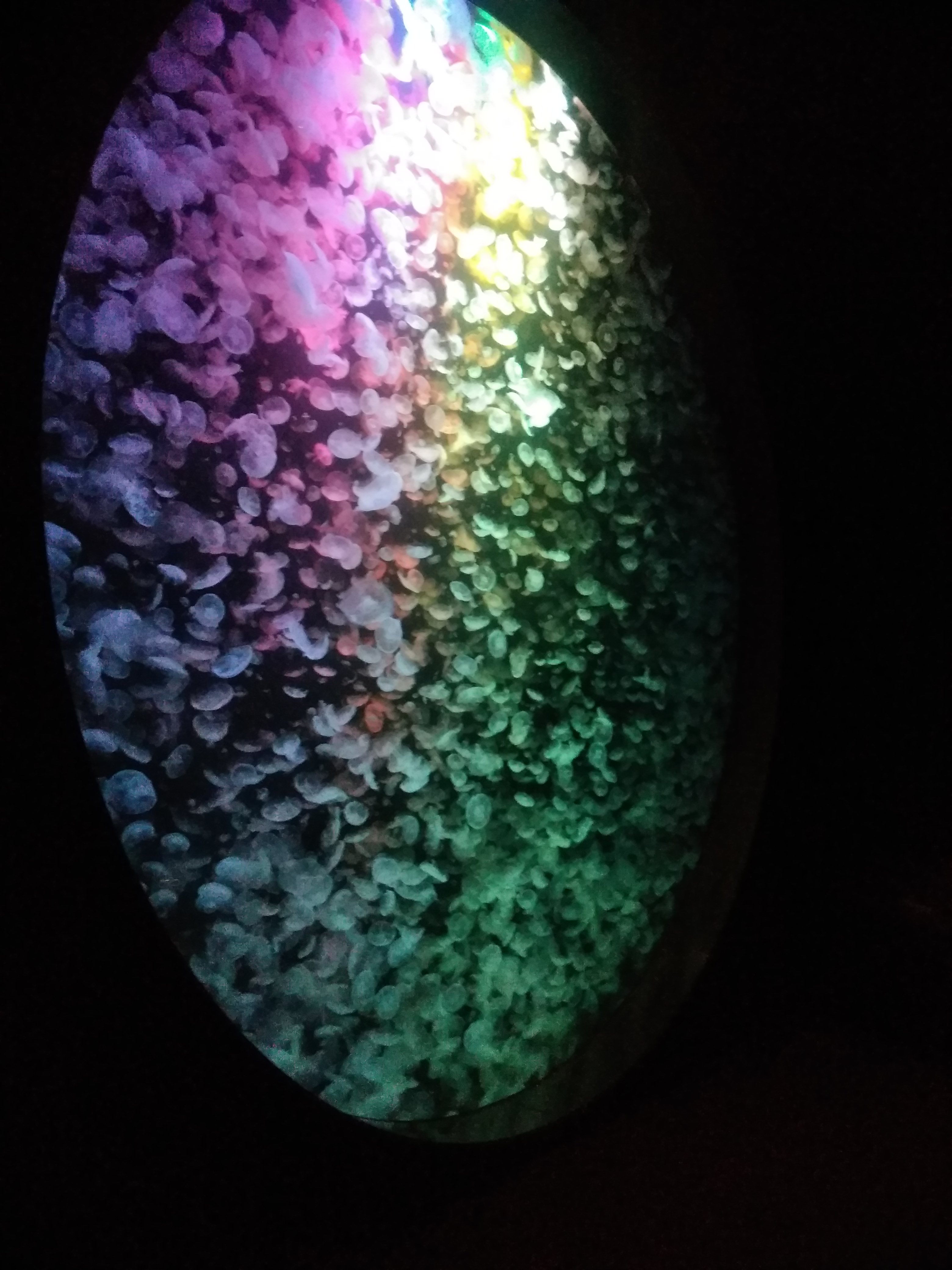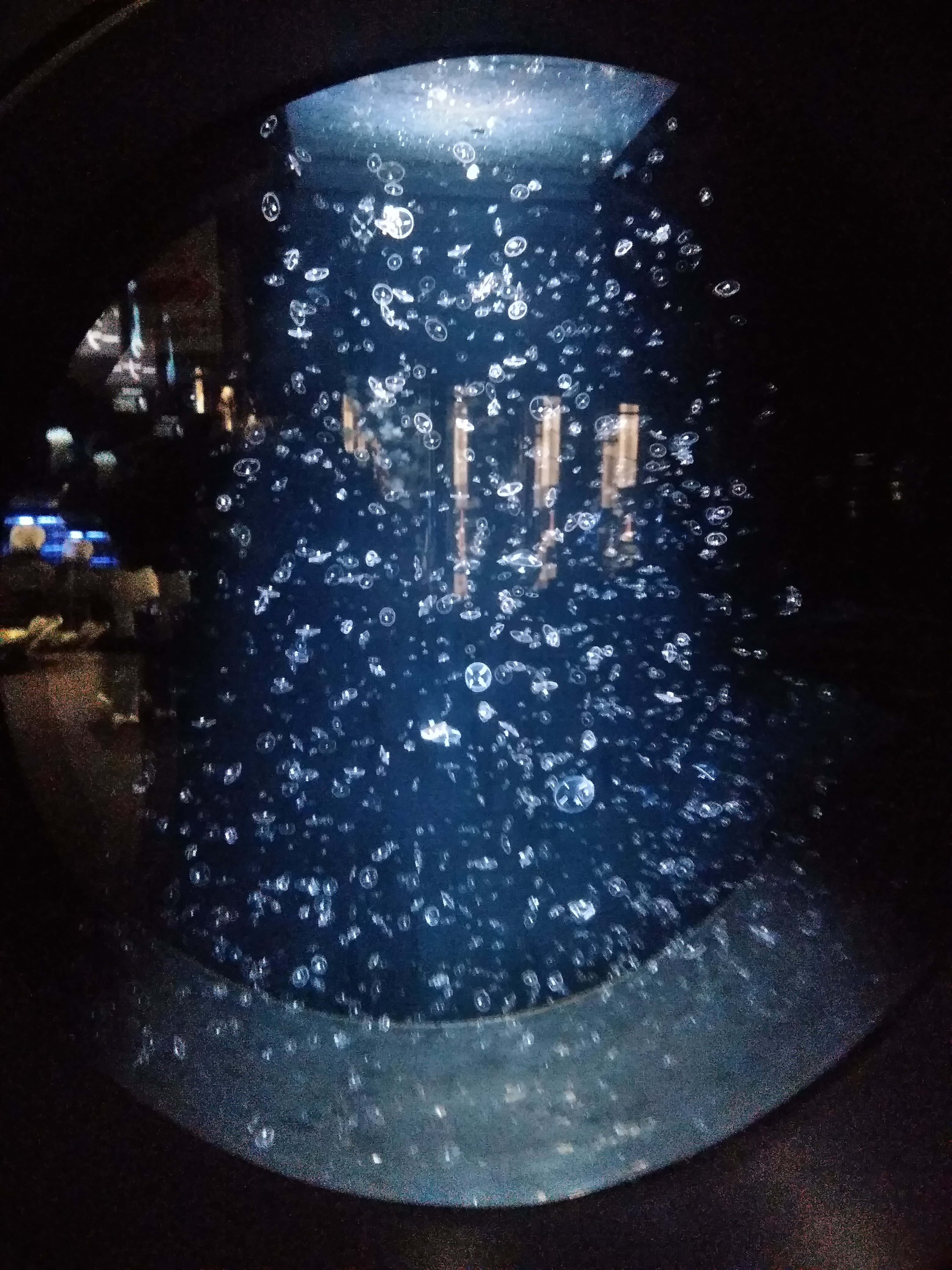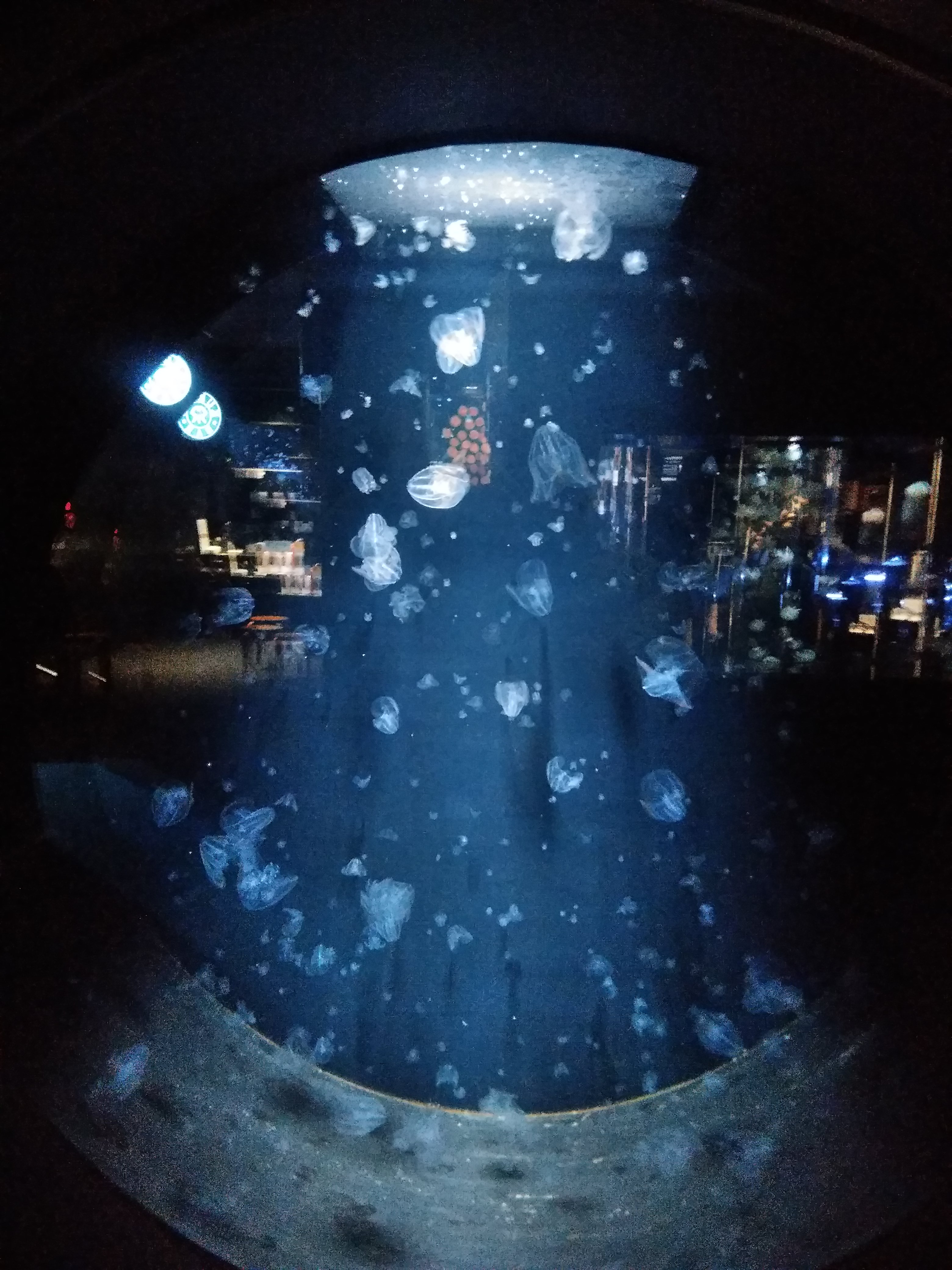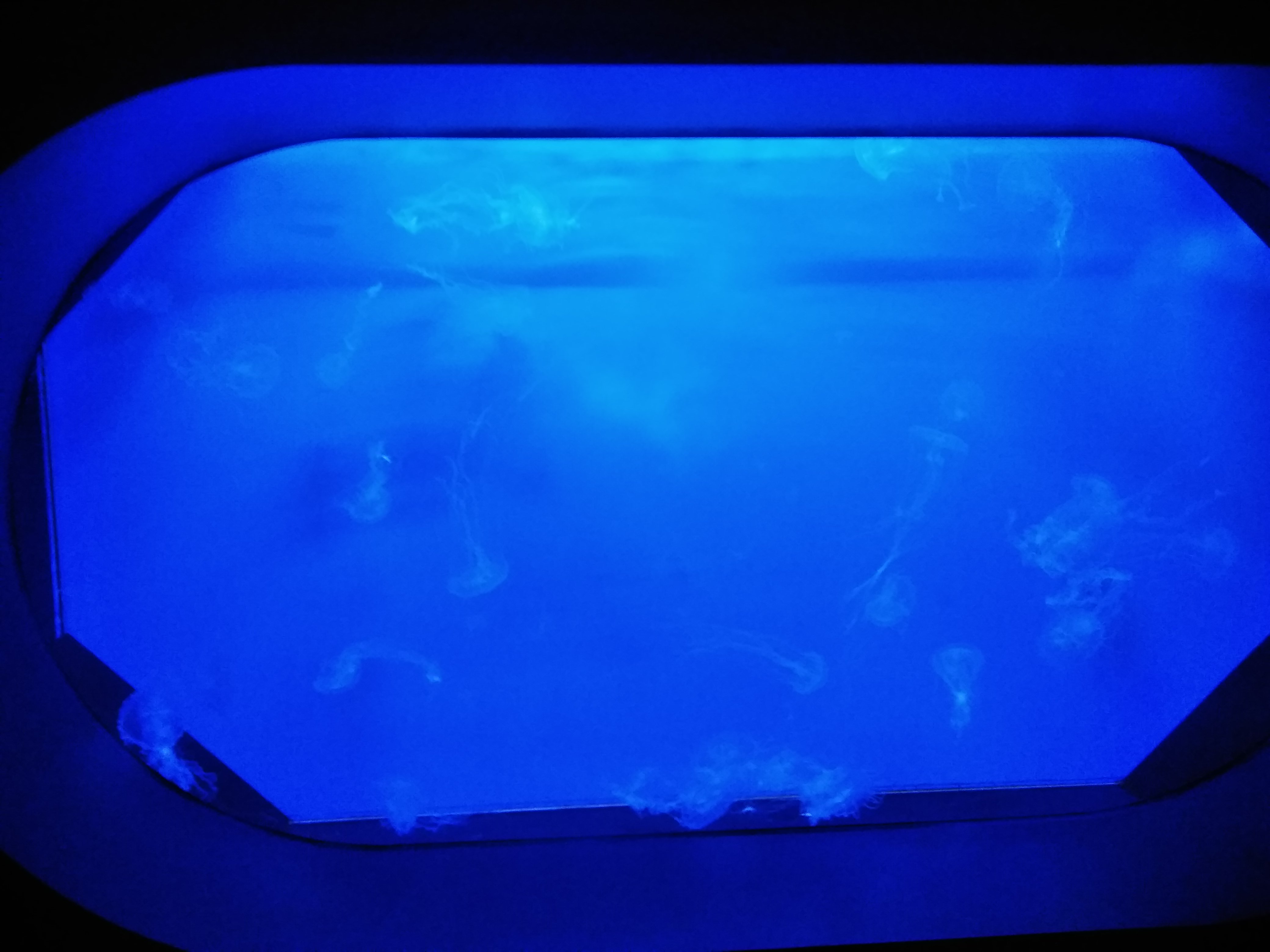 クラネタリウムの最大の見どころは世界に誇る、直径5 メートルの水槽「クラゲドリームシアター」に浮遊する約1万匹のミズクラゲです。凄いですね。感動的ですね。