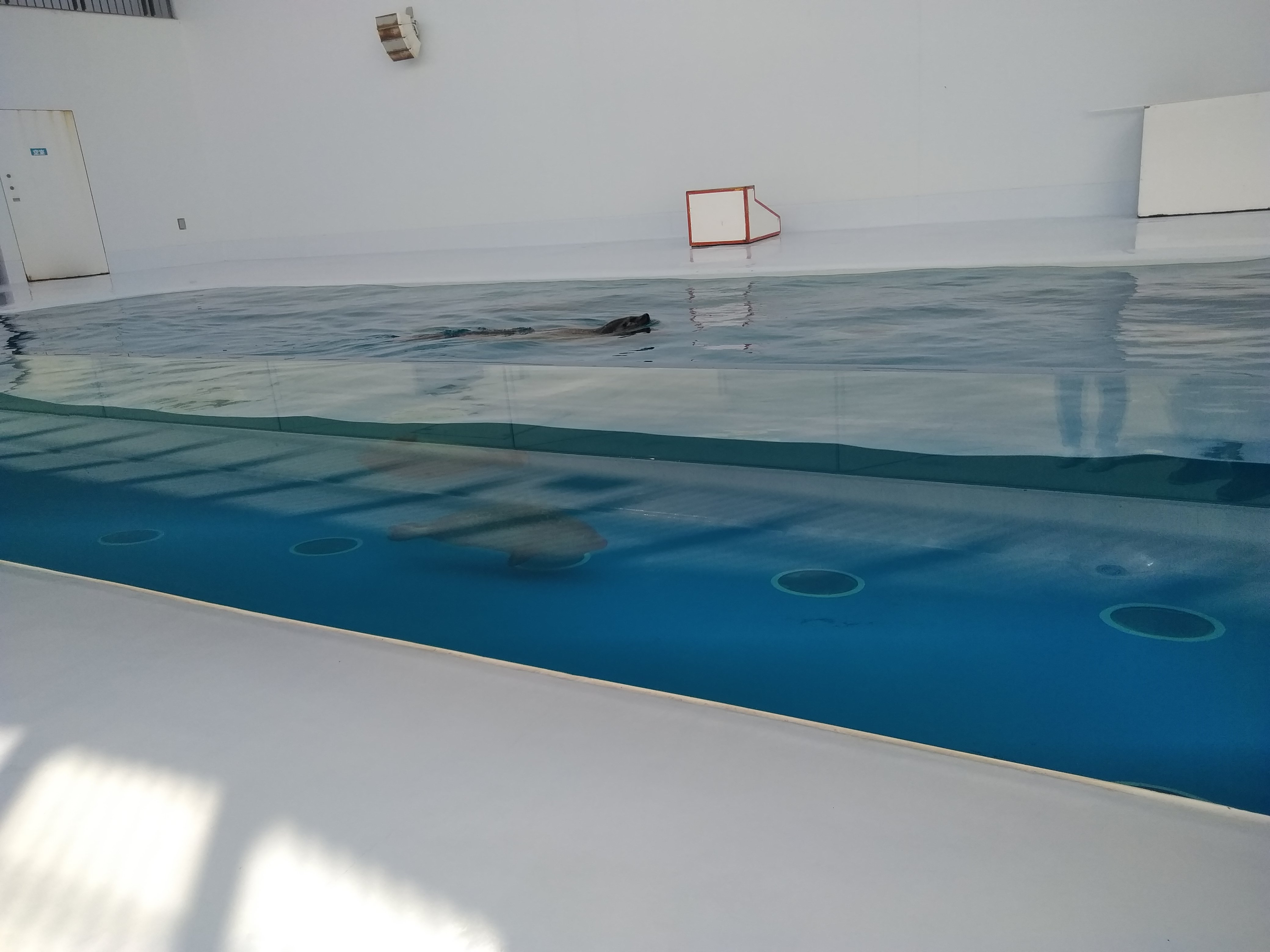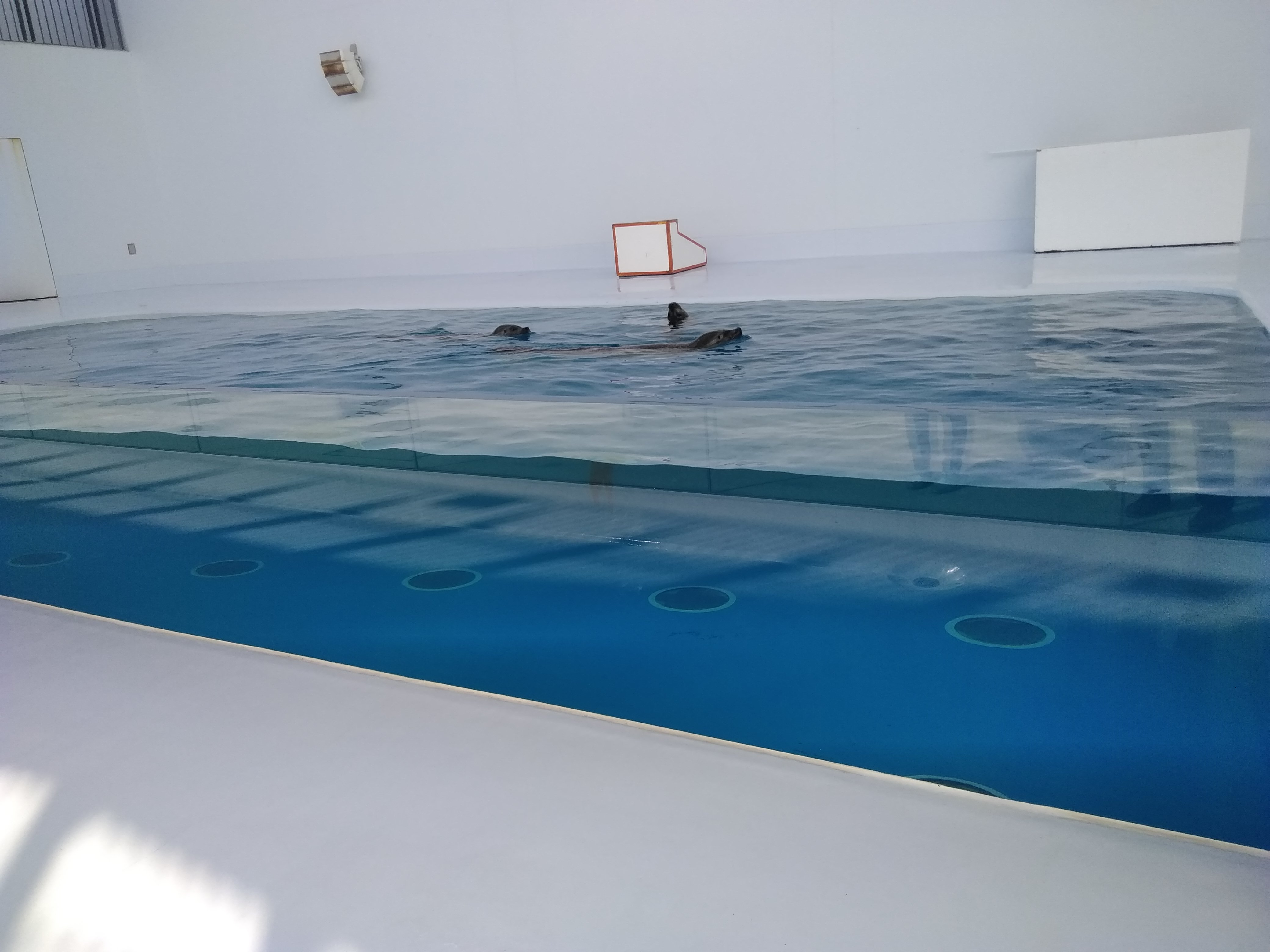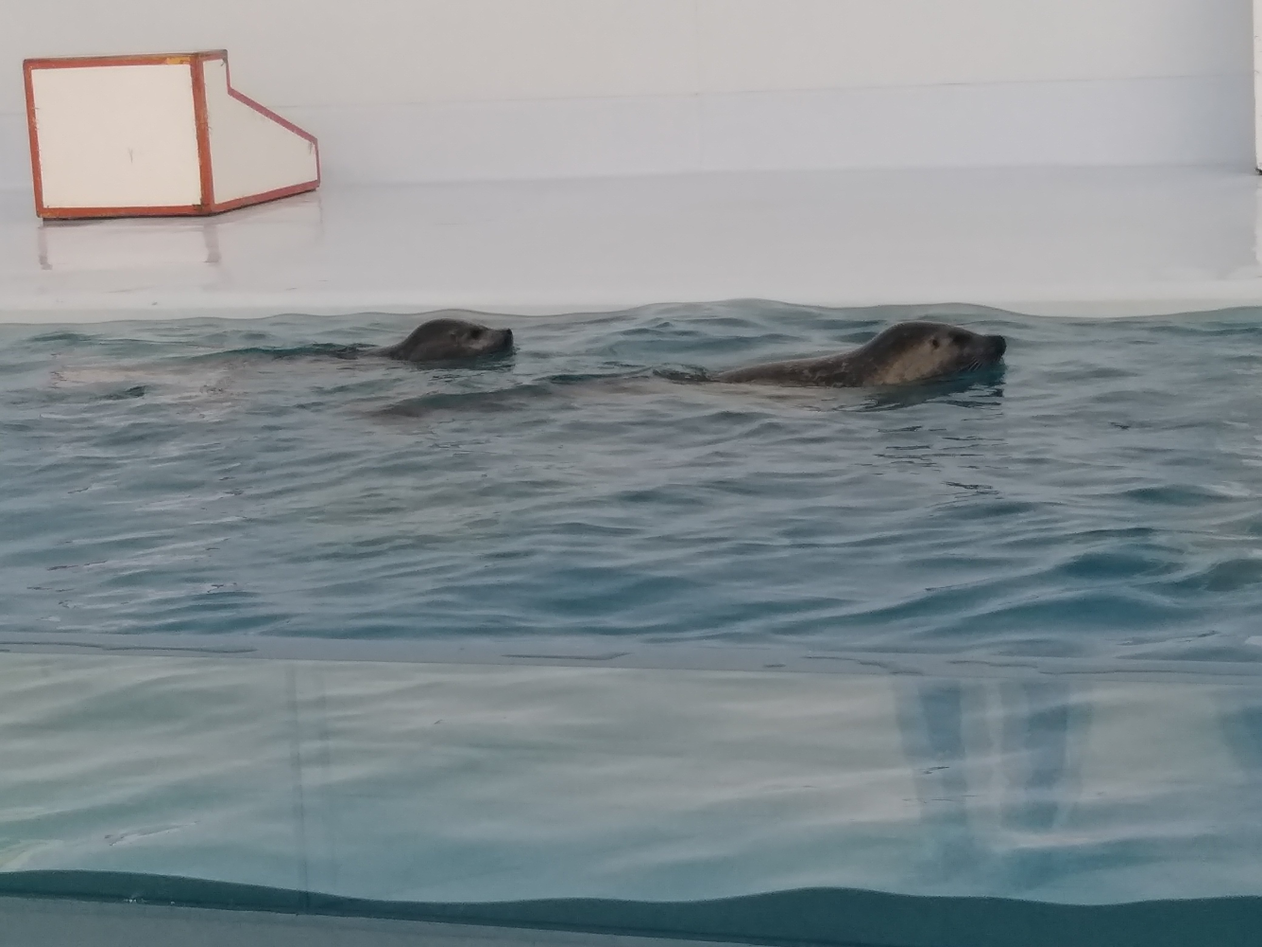 庄内の海や岩礁地をイメージしたプールで、くるくると泳ぎ回るゴマフアザラシと、ゆったりとプールを横切り、たまには陸に上がって寝転ぶキタゾウアザラシが見れます。