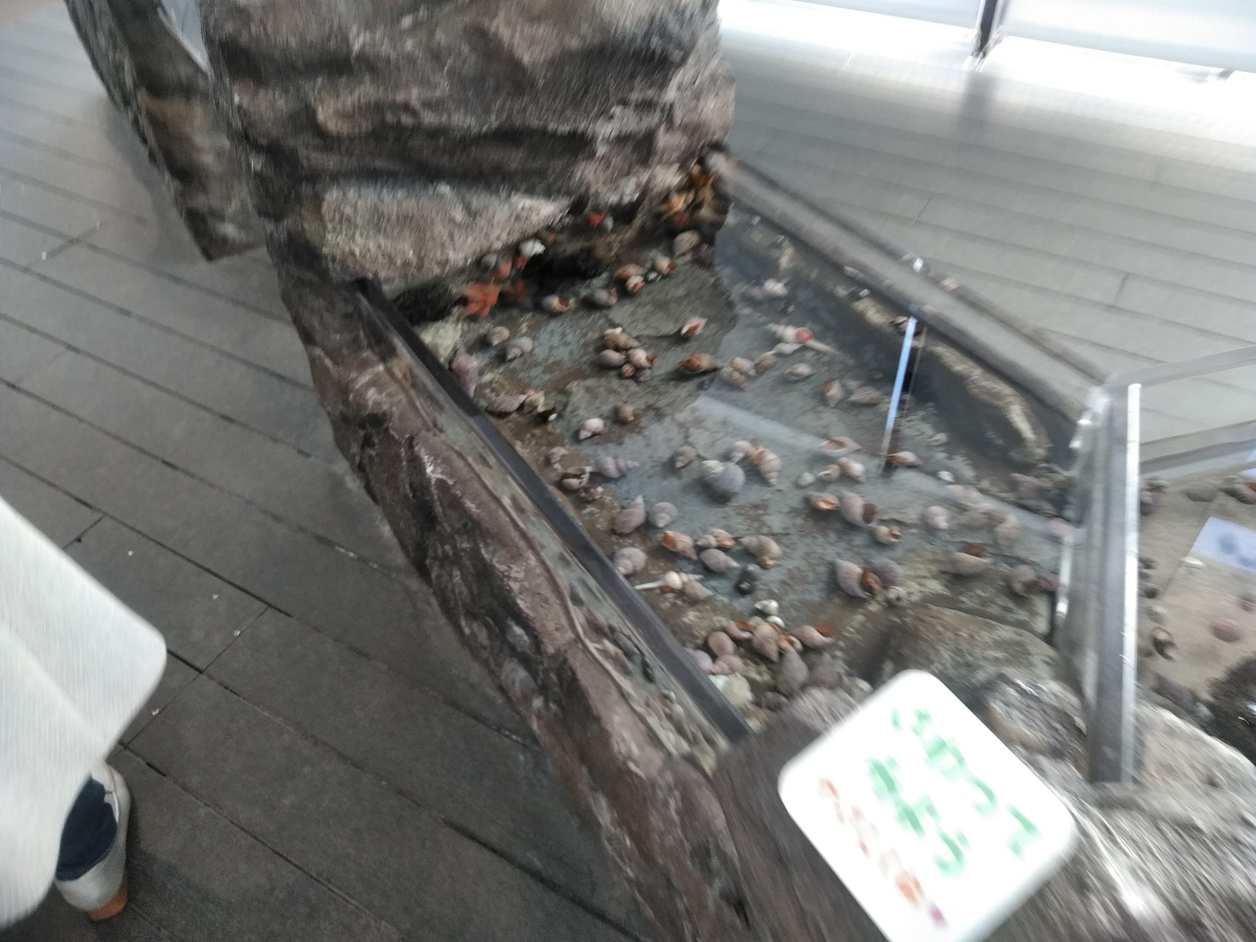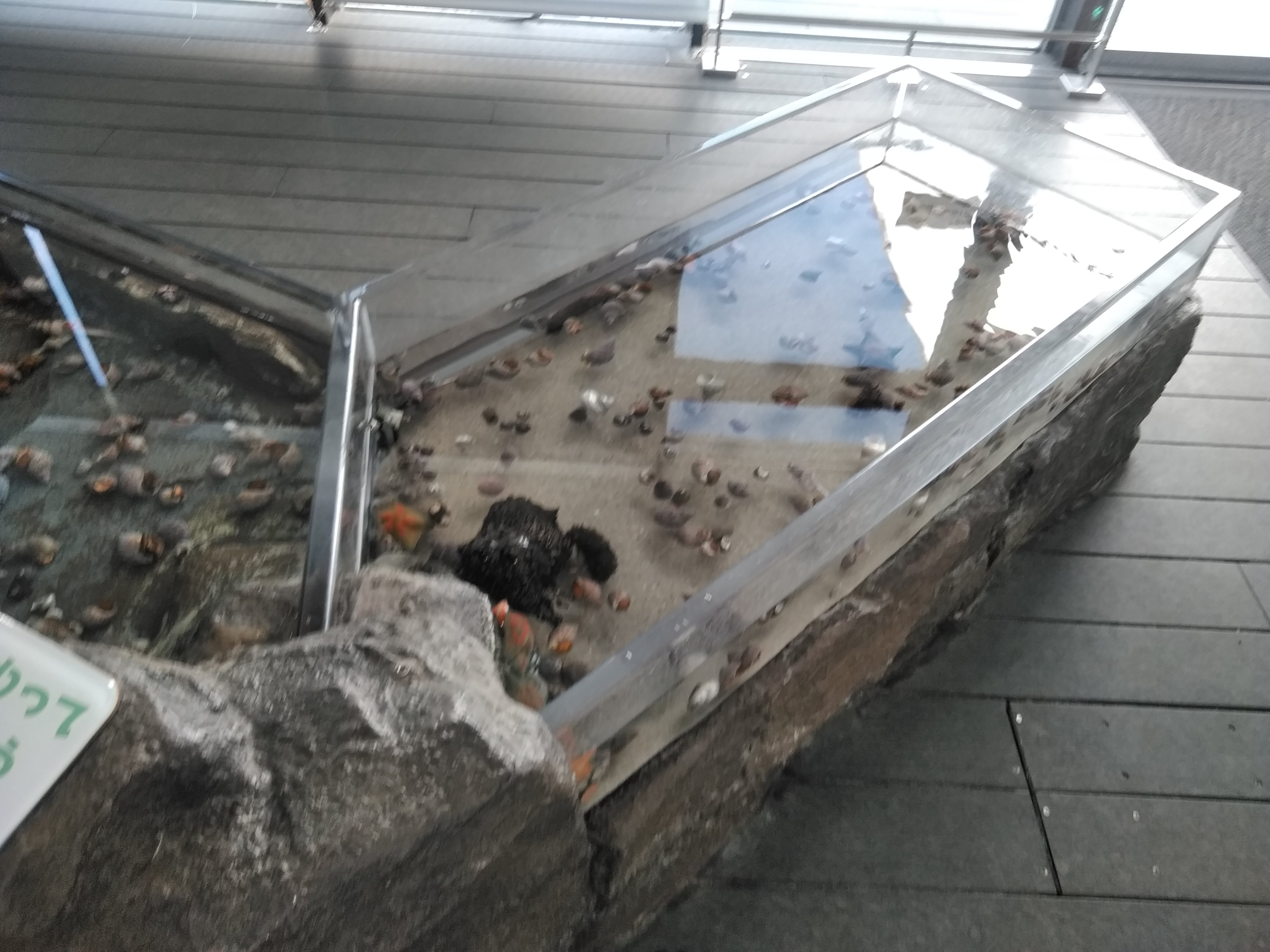 間近に見て、触れることのできる水槽。ヒトデやヤドカリがいます。
