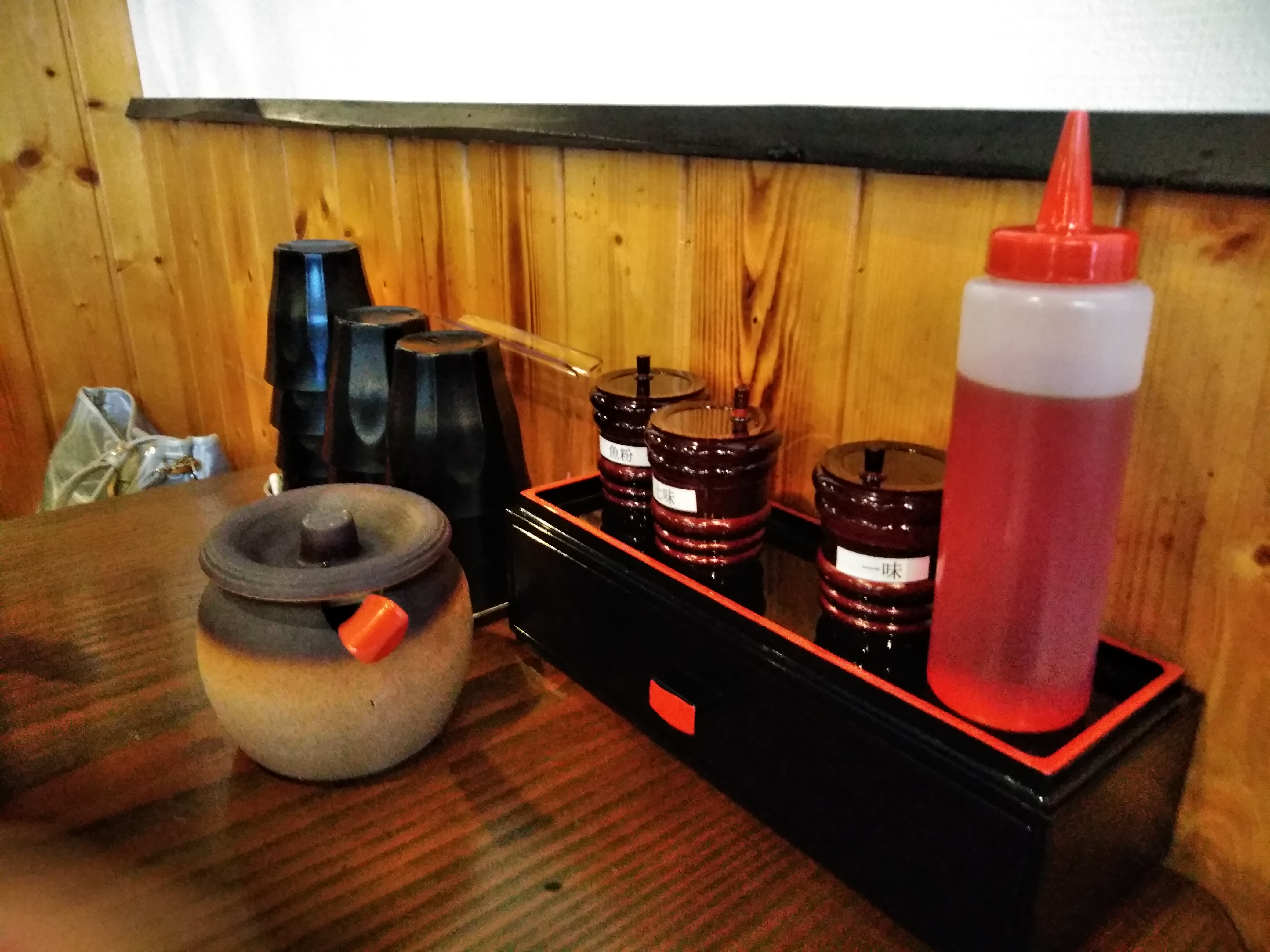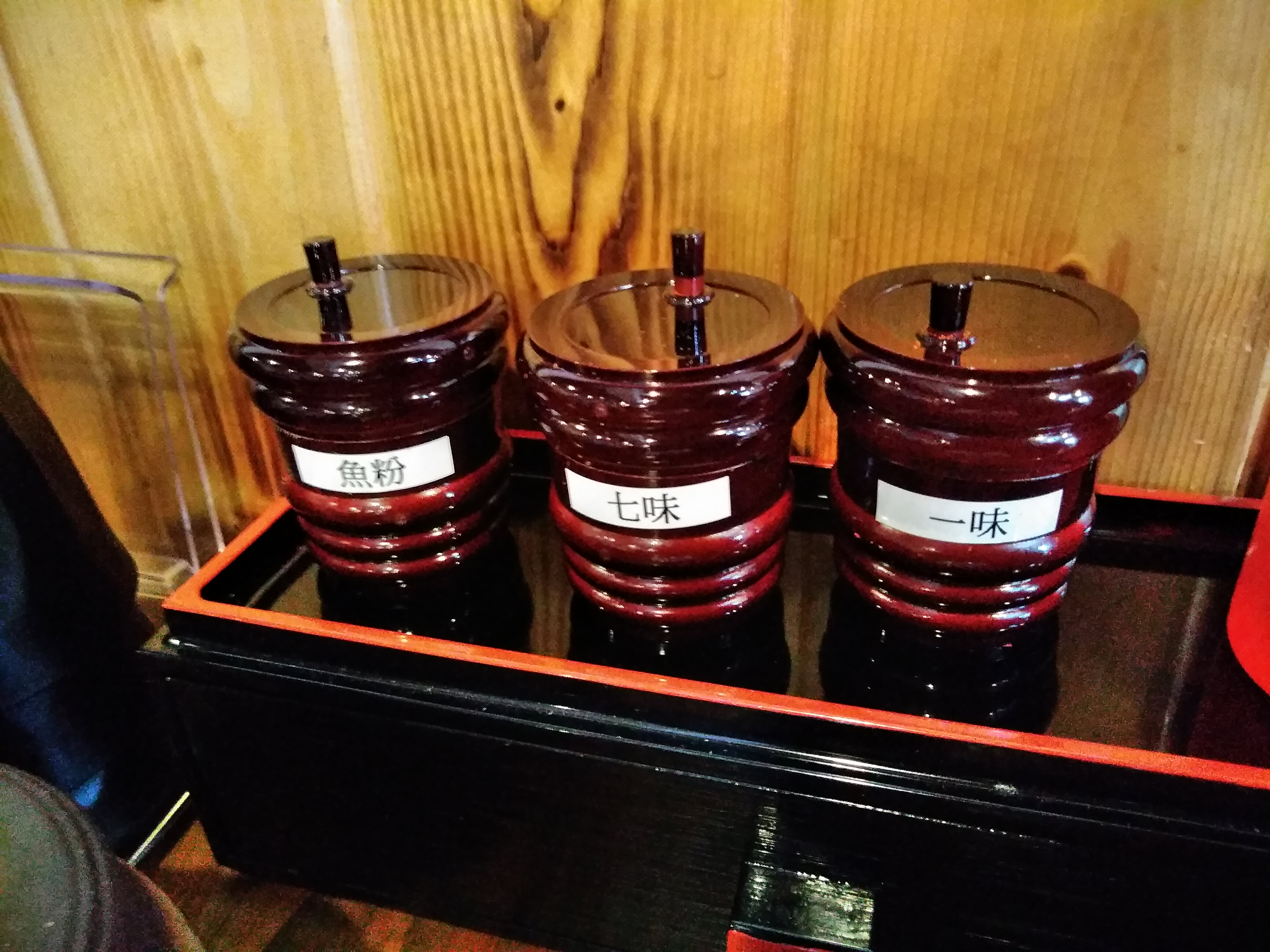 テーブルに置いてある調味料関係は、一味唐辛子、七味唐辛子、魚粉、ラー油、天かすです。