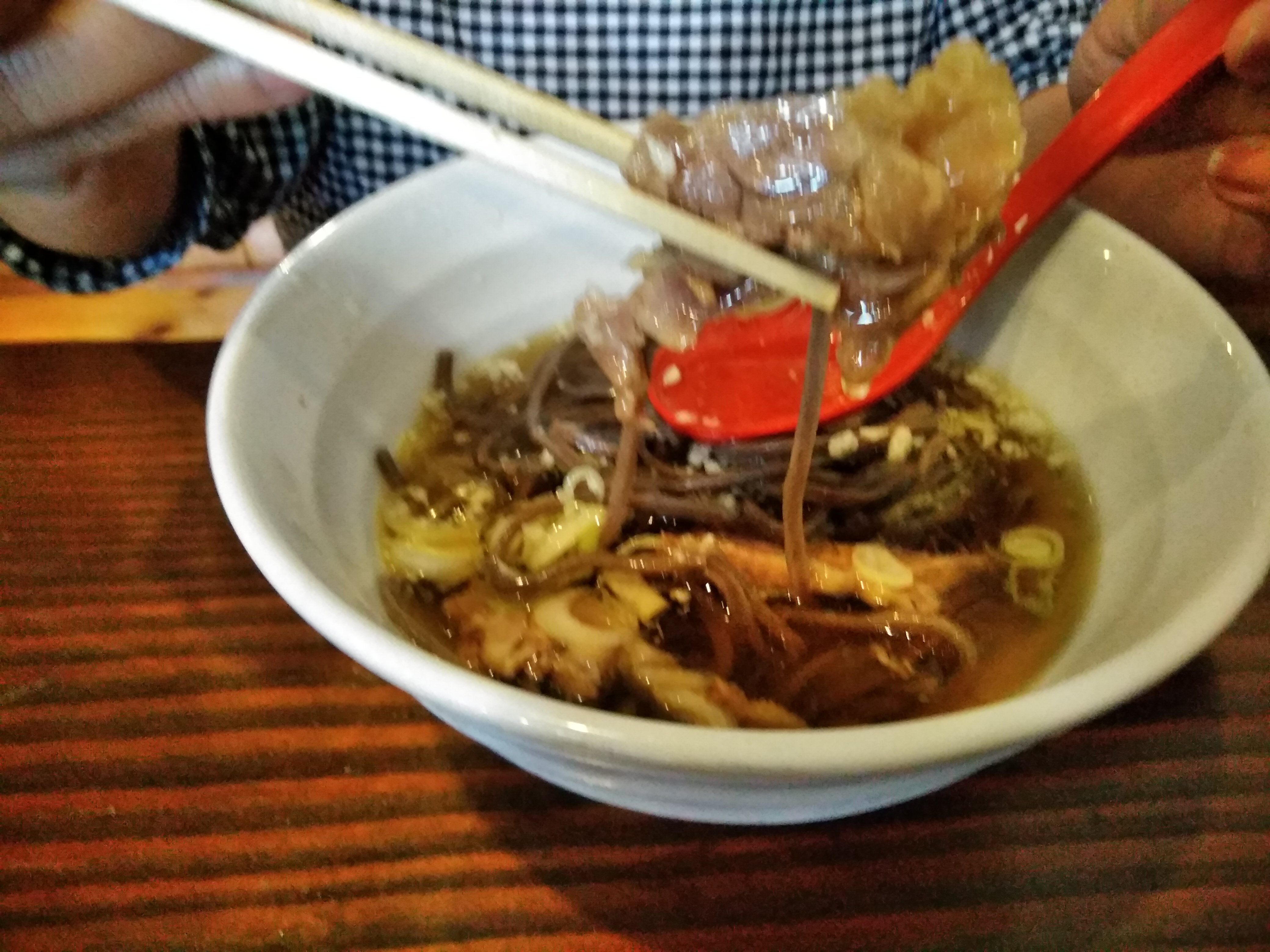 親鳥の鶏肉もたっぷり入ってました。こりこりとした食感が良かったですね。スープは鶏の出汁が効いた醤油が多めで私的には好みの味でした。