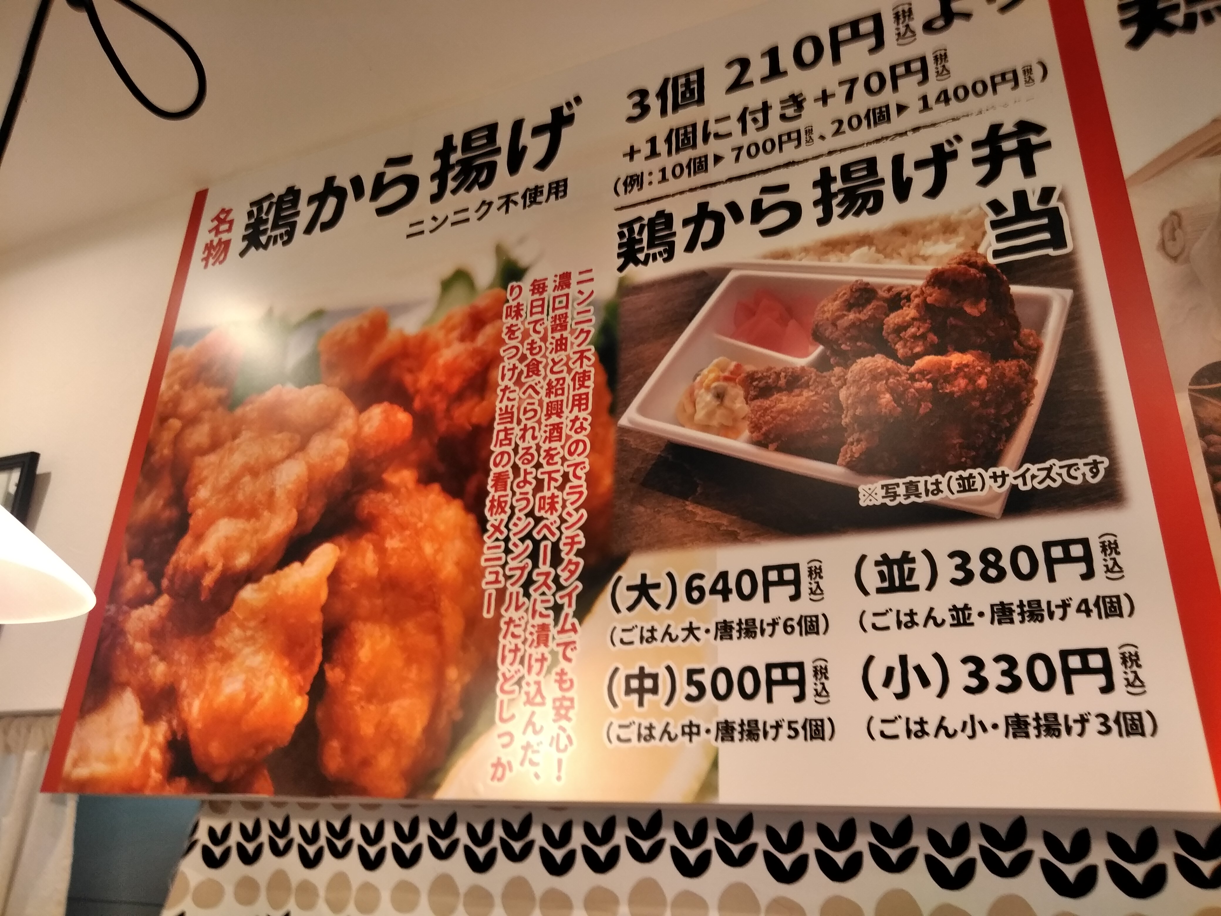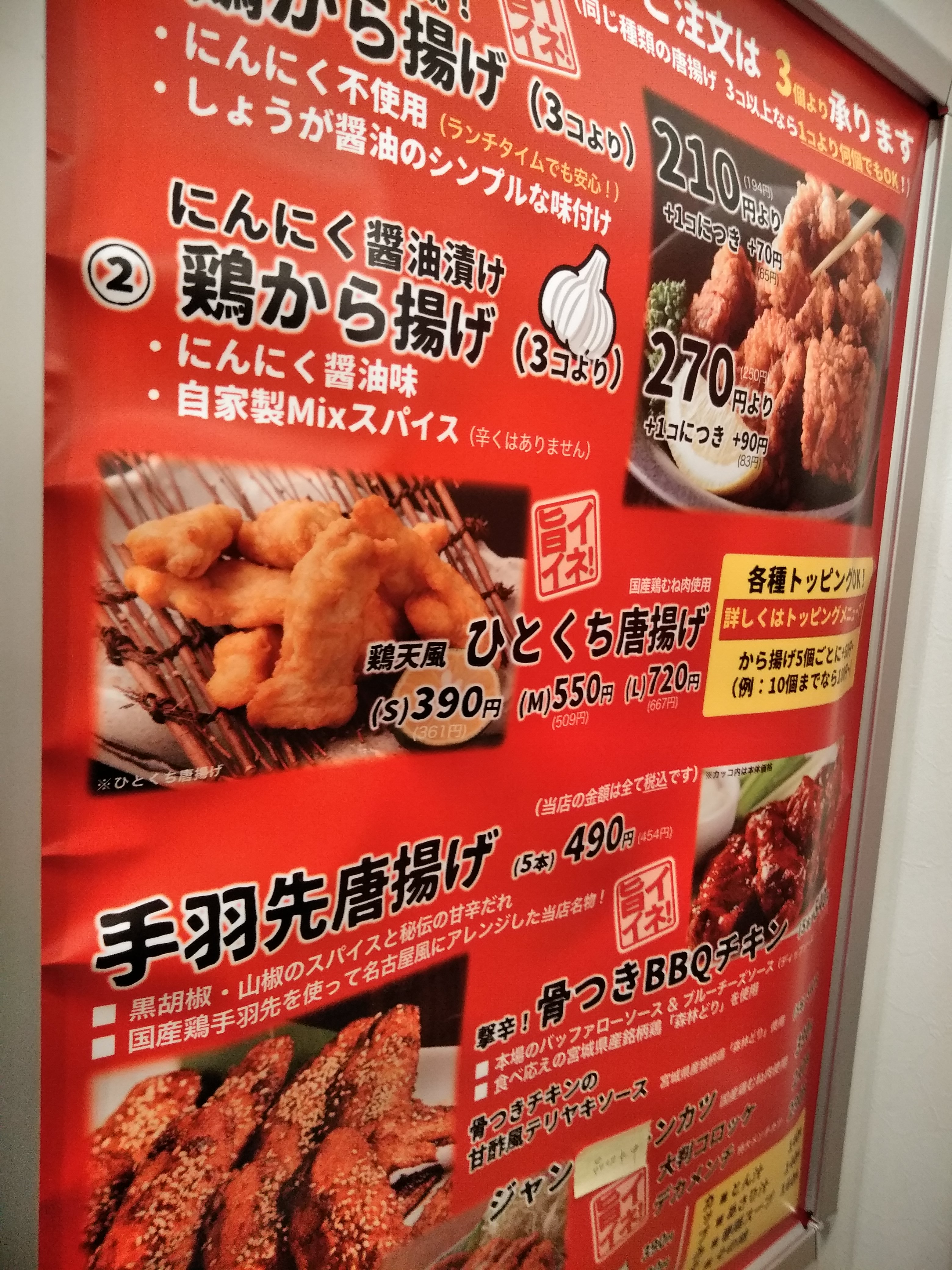 鶏から揚げは3個から注文できます。今回はお試しで3個購入【70円/個×3=210円(税込)】しましたが、安いですね。濃口醤油と紹興酒を下味ベースに漬け込んだしっかりした味は、ニンニク不使用でランチタイムでも安心ですね。