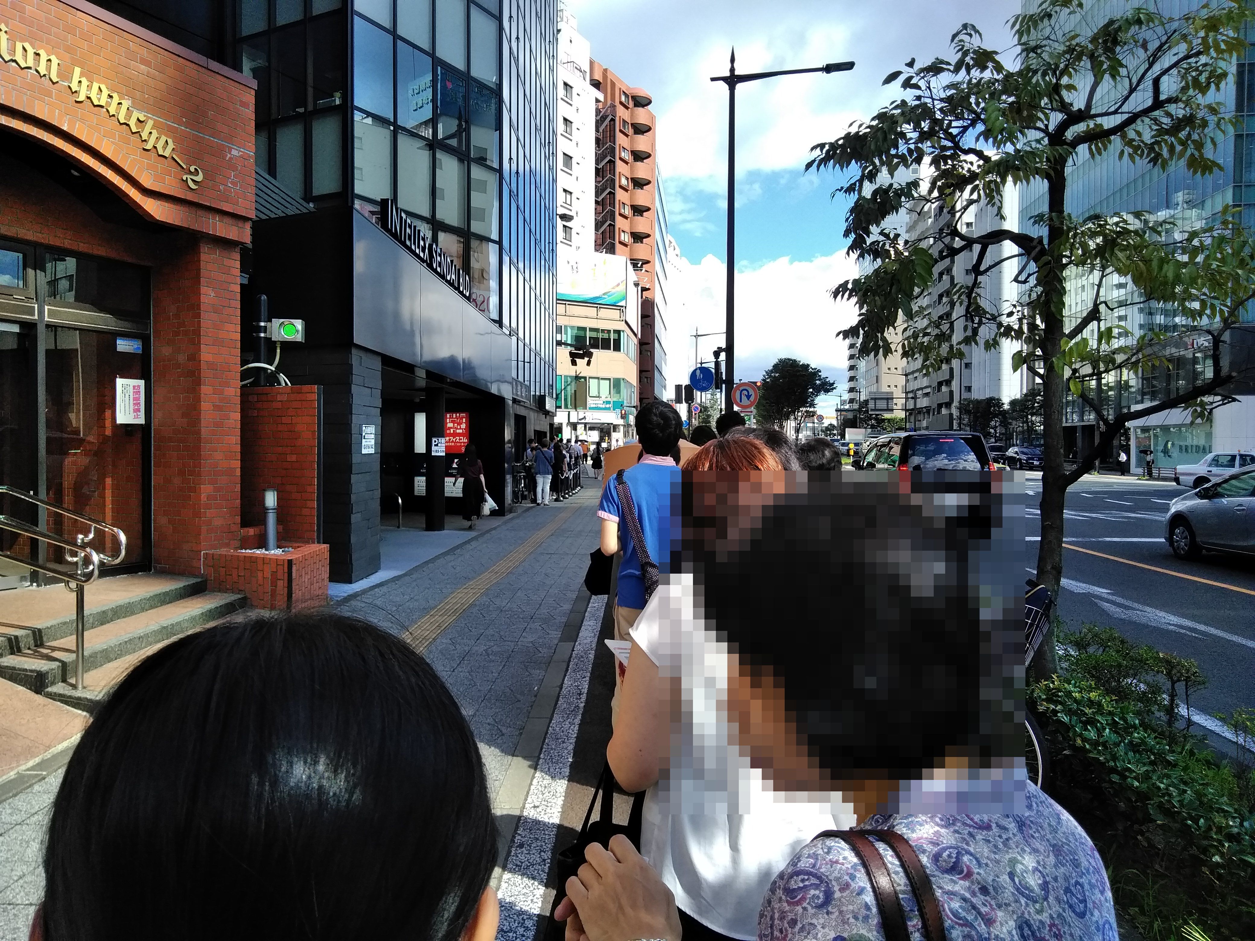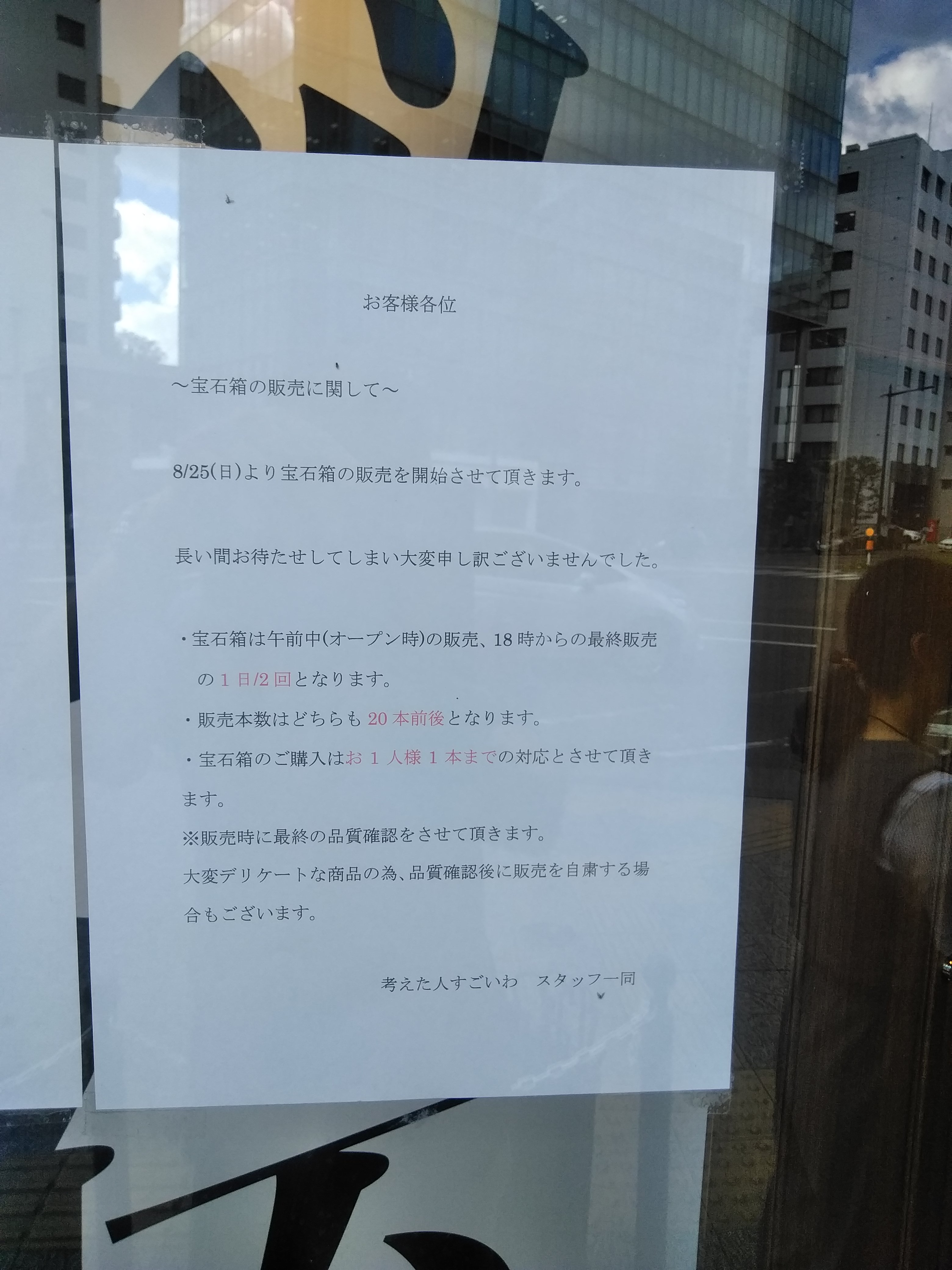 皆さん、8/25から販売開始した『宝石箱』を買おうとしている人だったのですが、朝9:00に販売する『宝石箱』は20本限定です。なので、既に朝の販売分は売切れ状態でした。今日の販売分は18:00からの20本だそうです。このぶんの整理券は配布せず、先着順での販売とのことです。仕方がないので、『魂仕込』の整理券を貰って、並びました。