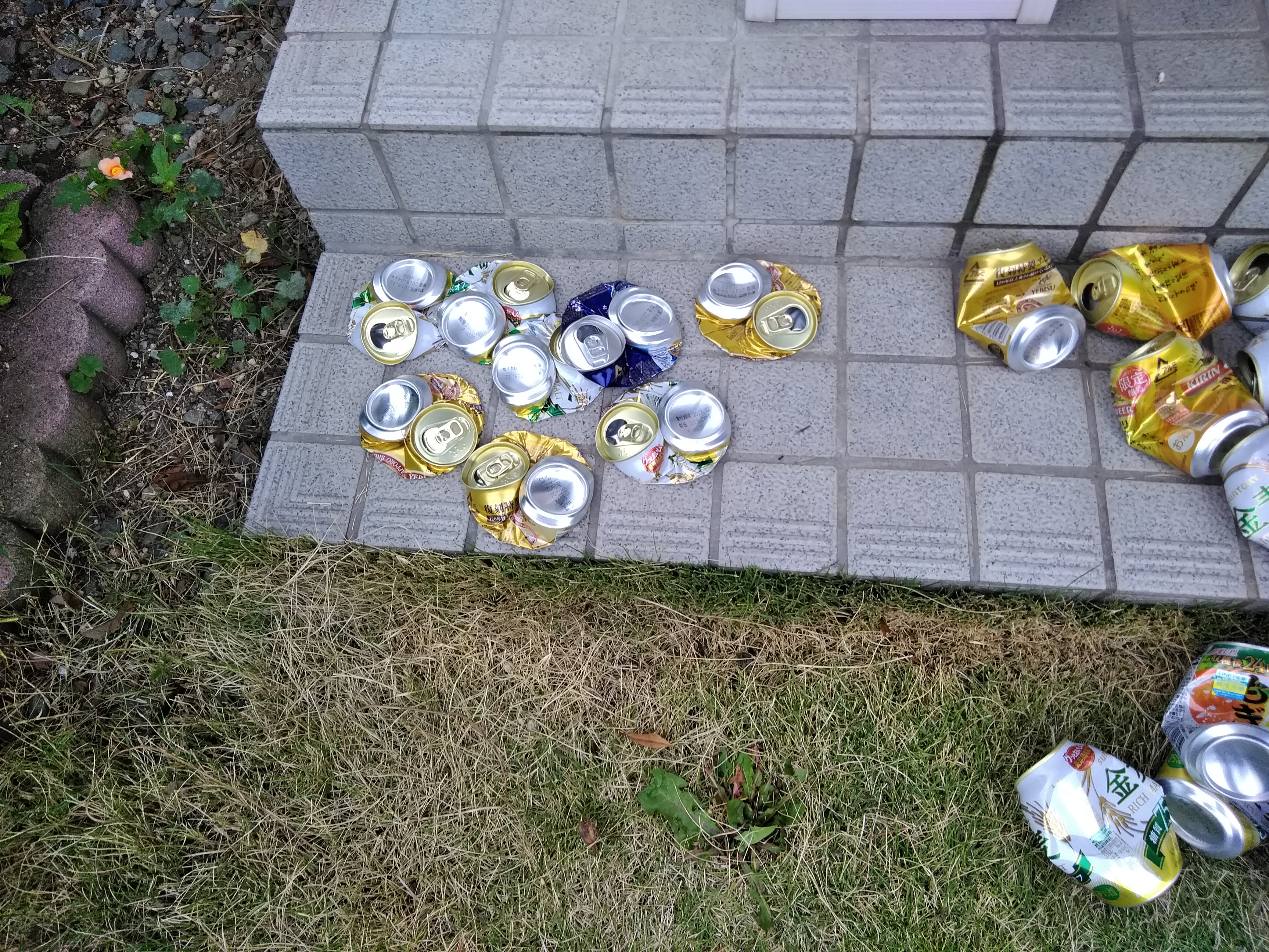 アルミ缶が大量にある場合は、事前につぶしておく必要があります。早速、自宅の庭でアルミ缶をつぶしました。