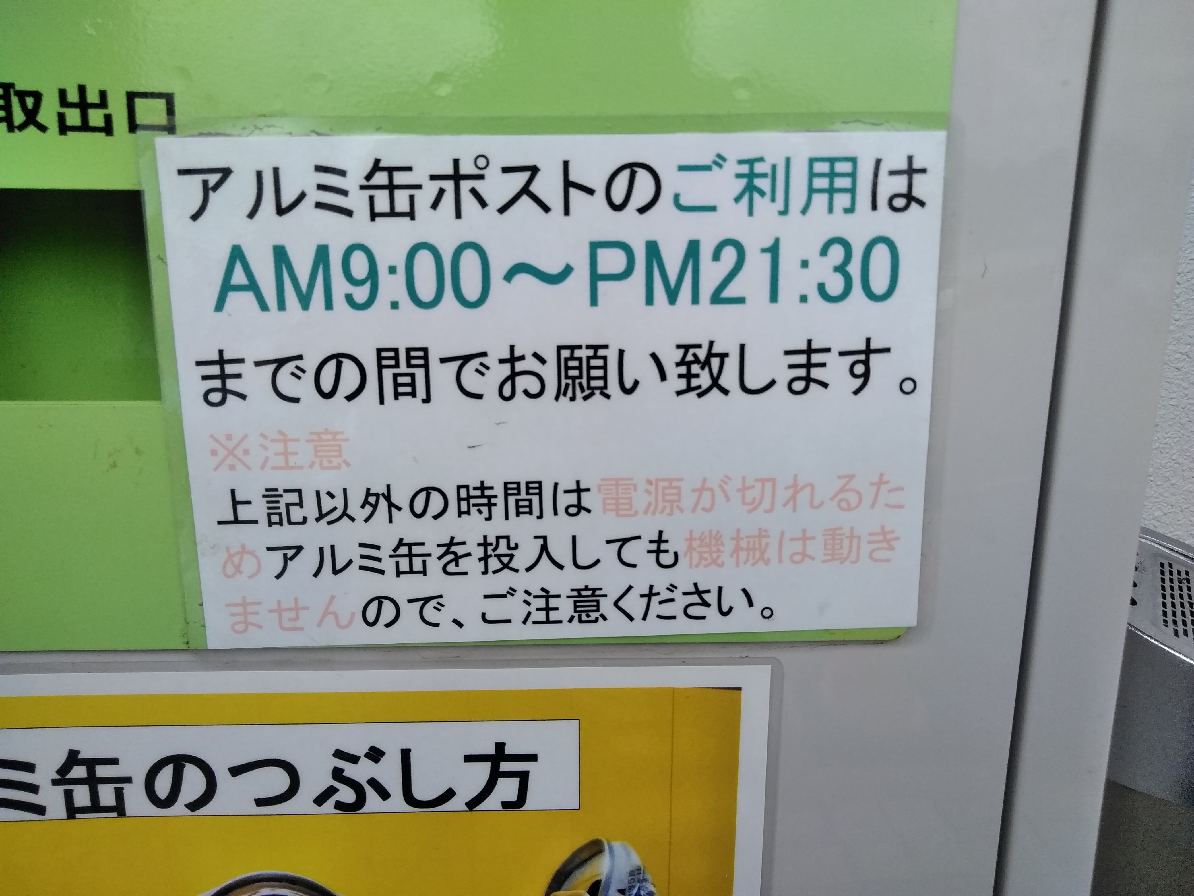 それからアルミ缶ポストの利用は9:00~21:30の間に限定されているようです。それ以外の時間は、アルミ缶ポストの電源が切れるので、回収はされないので注意して下さい。
