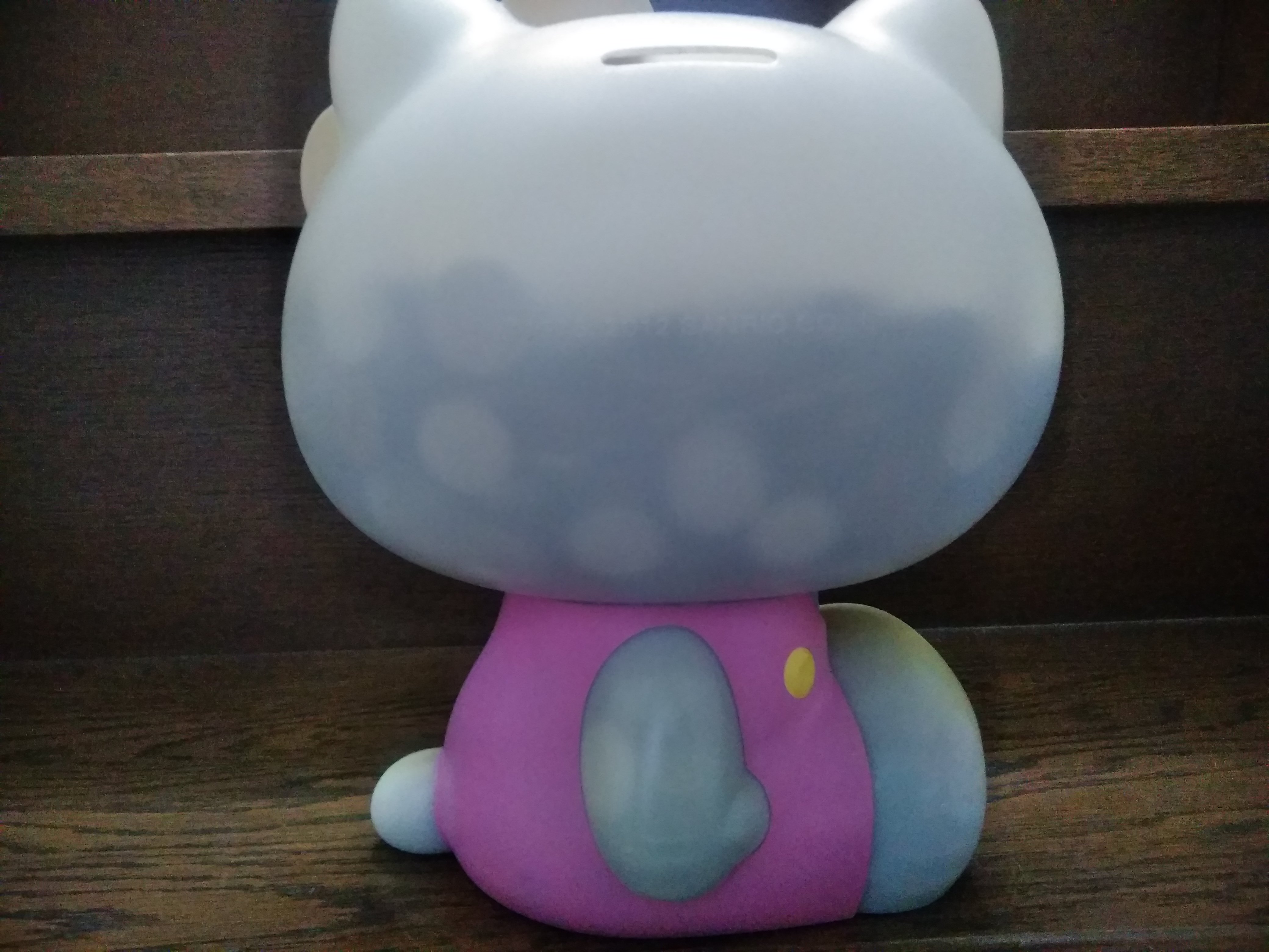 財布に小銭が多いと重いし、財布も膨らんでいやですよね。それと仕事の関係で毎日出社と退社の時に、所持品をチェックするので、小銭が多いと数えるのが大変です。それで、4年程前から私は、毎日小銭を貯金しています。その貯金箱は娘に貰ったキティちゃんの貯金箱です。