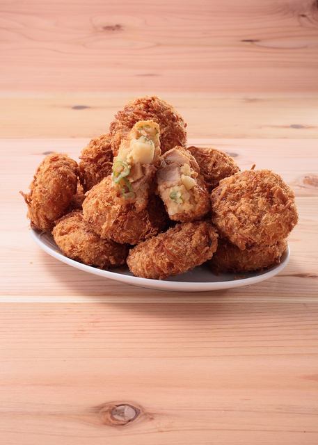 かつやでは「らーめんコロッケ」という、マッシュしたジャガイモにチャーシューやナルトなどを入れ、幸楽苑のラーメンのタレで味付けした商品を考案中です。「不思議なんですけど、食べるとラーメンの味がします」(臼井社長)。